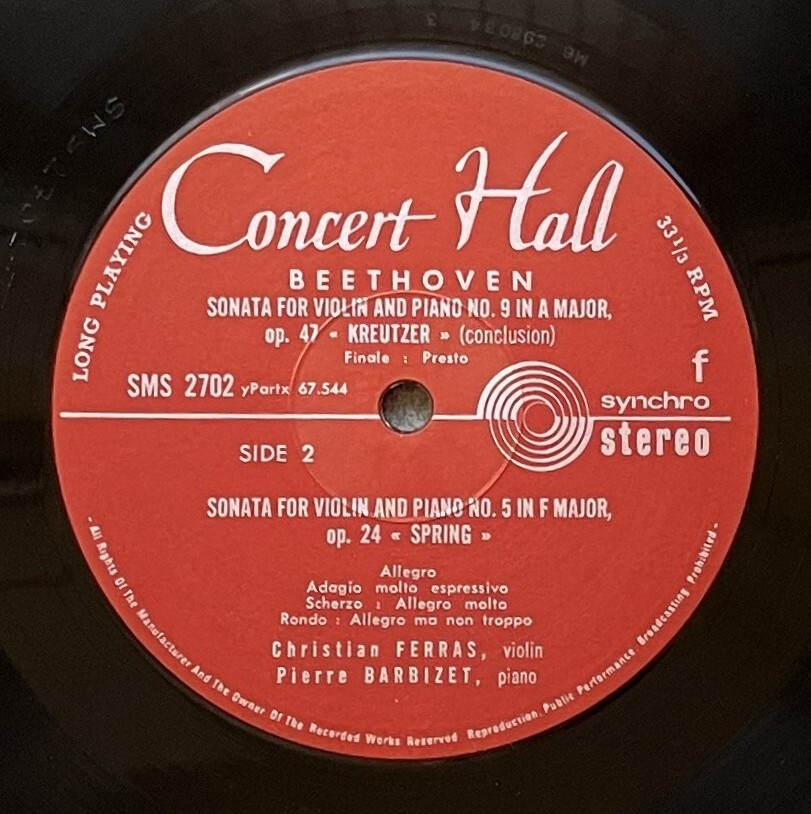 そのレコードは盤質が良いだけではありません。録音自体がConcert Hall製品ではかつてなかったほど素晴らしい音でとらえられており、音色、ステレオ感、響き、どれをとってもConcert Hall音源で最高位にあるものです。この音でフェラスとバルビゼによるベートーヴェンのヴァイオリン・ソナタ全曲のステレオ録音を聴けるのですからたまりません。これは夢のSMS盤とさえ言ってよいのかもしれません。