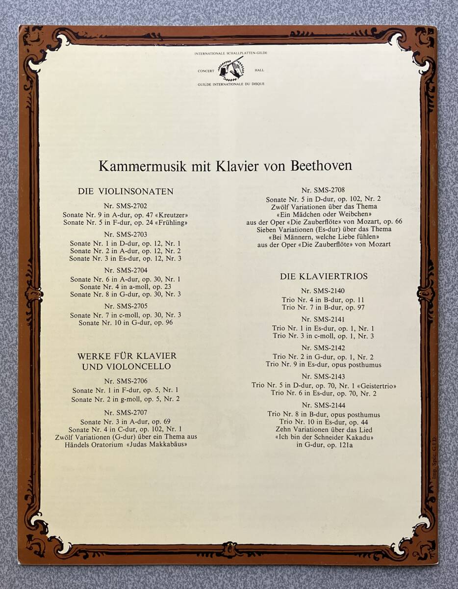 ここに出品するのは仏Concert Hall製造による商品ですが、ドイツ市場に向けたドイツ語解説書が入っている品です。(なお、解説書最終ページの曲目表にはピアノ・トリオも書いてありますが、これはConcert Hallがひとつの解説書をいくつかの製品で共用していたため(いい加減な合理化です)で、ここに出品する商品(7枚セット)にはピアノ・トリオは最初から入っていません。)