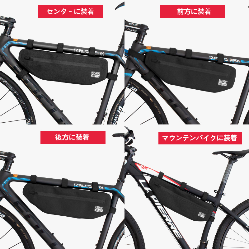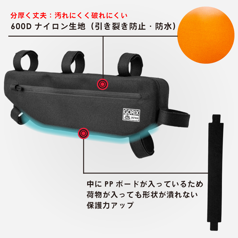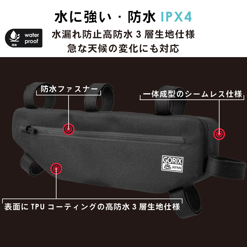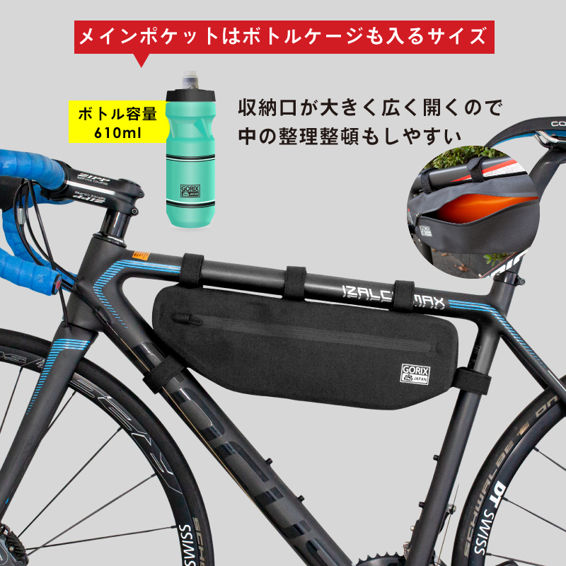 | ロードバイクやクロスバイク、マウンテンバイクなどのフレームに取付けできる自転車用フレームバッグ 空きスペースを有効活用して荷物を収納できます。 ジップは広く開ける事ができきるので取出しも楽々。 また防水対応で汚れにも強いのでサイクリングに最適です。 ・ペダリングの邪魔にならない幅サイズ ・柔軟に調整できるベルト位置 フレーム形状にあわせて組み替えできます。 ・水や汚れに強い素材 水漏れ防止高防水3層生地仕様 防水ファスナーでさらに防水効果をあげます。 破れにくい生地でタフなフレームバッグ ・ボトルケージなども入る容量1.8L 片面のサイドポケットはスマホなどの収納に ・夜間安心の反射ロゴ 夜間反射機能・事故防止などの安全対策に 暗闇でライト等の光に反射して存在をアピールし 追突などのリスクを軽減 サイズ:約長さ40x高さ12.5、幅6cm 重量:約390 g 商品内容:バッグx1、テープx5、説明書x1 附属ベルト取付可能径:約φ3-5cm 最大容量:約1.8L 自転車に取付位置:フレーム 防水仕様:防水レベルIPX4 適用フレームMAXサイズ:MTB/ロードバイク/クロスバイク ※自車のフレームサイズと合うとか必ず確認してください! 《ご注意》 ・商品は入荷によりキズがある場合があります。 保証対象外になりますのでご了承お願い致します。 ・ディスプレイ環境により実物と色が異なる場合が有ります。 ・入荷時期により予告無く一部仕様変更する場合が有ります。 ・車種、サイズによって取付できない場合があります。 形状やサイズなどををご確認の上ご購入下さい。 | |