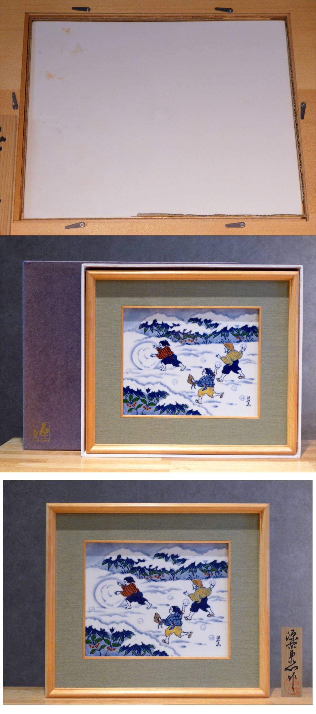 源右衛門 陶板画 雪合戦 子供 雪景色 専用箱付。陶板画:約24x19.5cm。主観ですが状態良好かと思われます。経年保存品の為、画像をよく見て頂き、状態に了承いただいた方のみの御入札をお願い致します。