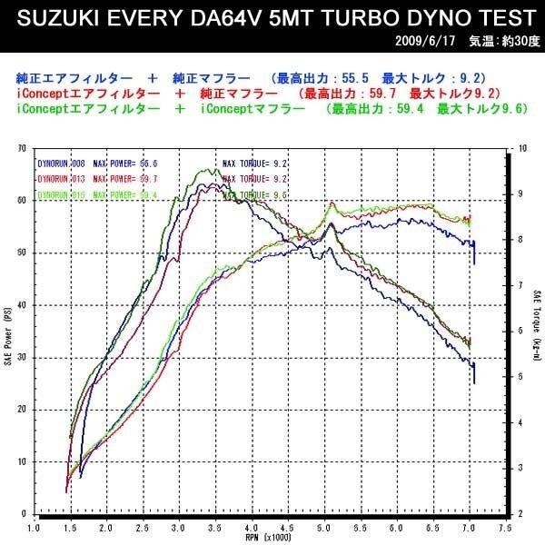 | 純正エアフィルター+純正マフラー(最高出力:55.5 最大トルク:9.2) iConceptエアフィルター+純正マフラー(最高出力:59.7 最大トルク:9.2) iConceptエアフィルター+iConceptマフラー(最高出力:59.4 最大トルク:9.6) |