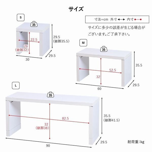 | 【カラー】 ブラウン、ダークブラウン、ホワイト 【サイズ】 <外寸> (S)幅30×奥行29.5×高さ29.5(継脚35.5)cm (M)幅60×奥行29.5×高さ35.5cm (L)幅90×奥行29.5×高さ35.5(継脚41.5)cm <内寸> (Sオープン部)幅22.5×奥行29.5×高さ26(継脚32)cm (Mオープン部)幅52.5×奥行29.5×高さ32cm (Lオープン部)幅82.5×奥行29.5×高さ32(継脚38)cm 【材質】 本体:プリント紙化粧合板 継脚:プリント紙化粧繊維板 【耐荷重】 天板:各(約)35kg以下 【生産国】 中国 【梱包】 サイズ:95.5×33×19.5cm、重量:19.8kg 【その他】 ・脚裏フェルト付き 【組み立て品】 お客様による組み立てが必要です。 【ご注意】 ・サイズ、重量は概算です。 ・商品カラーはご使用のモニターによって実際の明るさや色と異なって見える場合がございます。 |