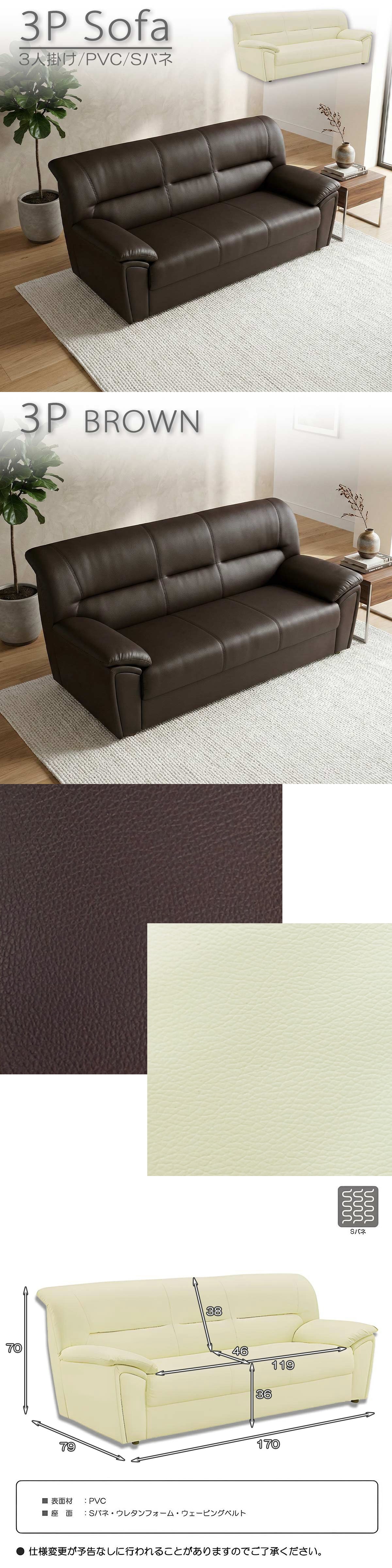 | 特 徴 | シンプルでモダンな3人掛けソファーです。リビングをおしゃれな空間に変えます。 張地はお手入れが簡単なPVCとなっております。 ブラウン・アイボリーの2色からお部屋の雰囲気に合わせてお選びください。 | | 商品サイズ | 本体:幅170×奥行79×高さ70cm 座面高さ:36cm 重量:約30kg