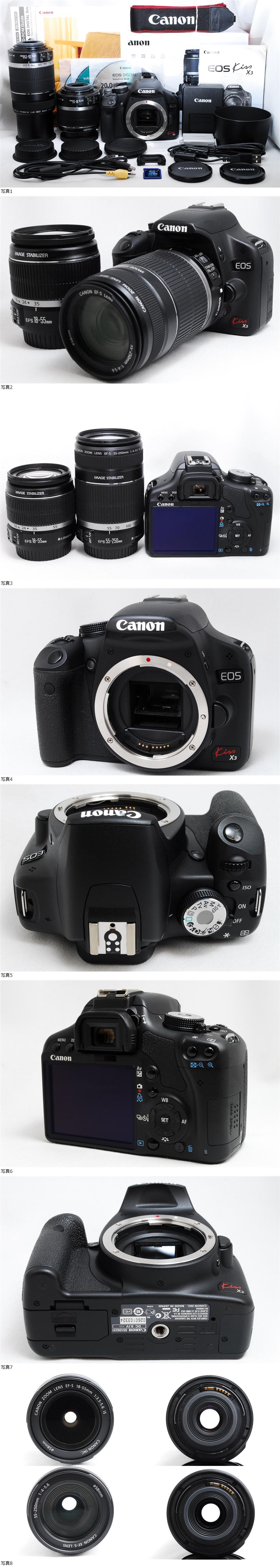 コンディション良好な!! CANON EOS Kiss X3が入荷しました~♪♪ 標準レンズ 18-55mm 、 超望遠レンズ 55-250mm Wレンズセット♪♪ 撮影に必要な バッテリー、充電器、SDカード、説明書 USBケーブル、Solution Disk など付属♪♪ 商品がお手元に届いたら即撮影を楽しむ事が出来ます!! お求めやすい即決価格で出品します!! 1個限定です。お見逃しなく!! ■本機の状態 外観に僅かなスレありますが、全体的に綺麗な状態です。 ファインダーは小ごみ、ほこりもほとんどございません。 好調な状態を保っております。 各機能問題なく動作快調です。 ■レンズについて ◆標準レンズ 18-55mm CANON純正のショートズームレンズです。 軽くて取り回しが良く、手ブレ補正機構搭載で優秀です。 ポートレート撮影、日常のスナップなど幅広く活躍します。 ◆超望遠レンズ 55-250mm 純正の軽量コンパクトな望遠レンズです。 スポーツ観戦や遠くの景色を撮影するのに重宝します。 レンズ内、ホコリの混入も僅かで綺麗な状態です。 新品ですと高価なのでお得だと思いますし ZOOMも利くので扱いやすいレンズだと思います。 kiss x3は フルHD動画搭載!! 一眼レフの表現力を、そのまま動画でおさめる事ができます。 コンパクトで小さめなボディのため、女性の小さな手でも扱いやすいです。 とりあえず、自動モードでシャッターボタンを押せば、 簡単にスマホよりワンランク上の写真が撮れます♪ 1510万画素でスペックも高いので、本格使用も可能な機種です。 最新機種もいいですが、まずは実力派の人気中古で ガンガン使って楽しむのもよいと思います。 中古良品をお探しの方は、是非ご検討くださいませ☆ ■付属品 ・ボディ ・ボディキャップ ・アイピースキャップ ・バッテリー ・充電器 ・Canon EF-S18-55mm F3.5-5.6 IS /レンズキャップ前後 ・Canon EF-S55-250mm F4-5.6 IS /レンズキャップ前後 ・EOSストラップ ・CD-ROM (Solution Disk) ・CD-ROM (ソフトウェア使用説明書) ・CD-ROM (STEP UP PHOTOGRAPHY) ・AVケーブル ・USBケーブル ・元箱 ・説明書 ★特典付き★ ・SDカード 32GB ・レンズフード Canon ET-60 ※万一配送中の破損や、本説明文と著しい相違などがありました際は、 速やかに返品やご返金、または同等品との交換などの対応をさせていただきますので、下記のコメント欄をお目通しいただければと思います。 | |