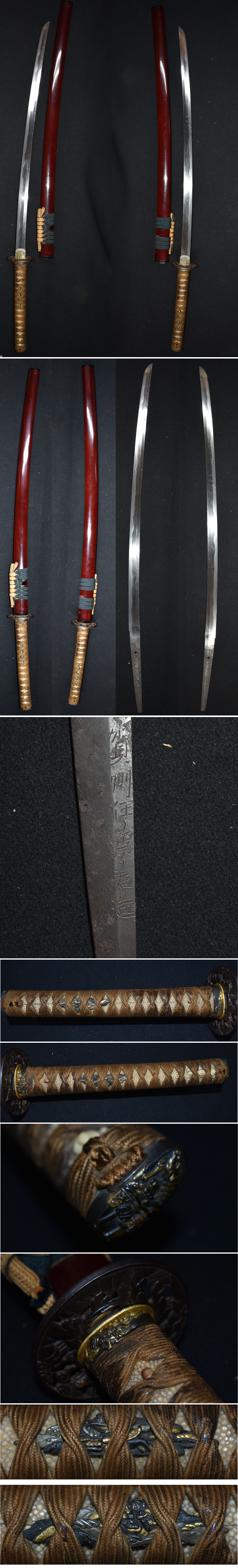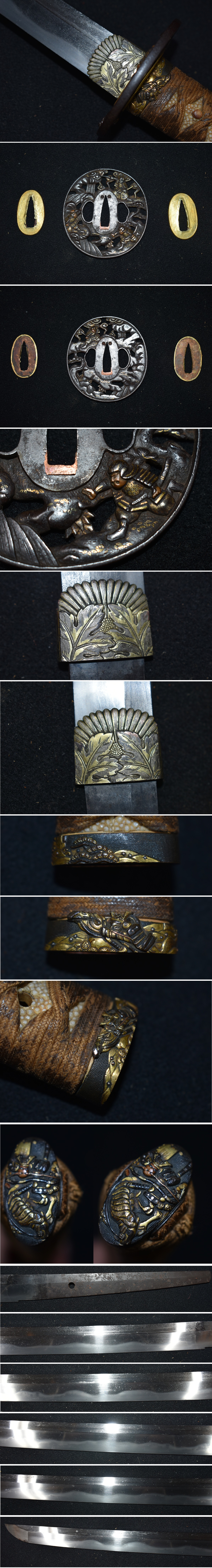 ご覧いただきありがとうございます。今回出品する品物は、写真の刀です。 銃砲刀剣類登録証番号 青森県 第5082号 種別 刀 長さ 二尺三寸五分0厘 反り 四分五厘 目くぎ穴 1個 元幅約3.1センチ 元重約0.75センチ 先幅約2.0センチ 刀身だけの重量約730グラム 在銘 賀州住兼若造(又助) (保存刀剣鑑定書付) 青森県の大名登録刀である「賀州住兼若」の二代目です。保存刀剣にも合格しました兼若です。 保存刀剣にしか出していませんが、もちろん初茎ですので、特別保存刀剣も合格すると思います。 加賀藩工の中でも最高峰に人気で、出来も切れ味もトップクラスの兼若です。青森県の大名登録刀 であるこの御刀は、拵えも抜群の素晴らしい絢爛豪華な拵えになっています。 金具は、藻柄子宗典で有名な、藻柄子金具です。鍔は鉄地金銀象嵌の武者図で藻柄子が得意とする 武者図です。縁頭ももちろん武者図で赤銅金銀象嵌です。縁金具は、盛り上げで武者や馬が立体的 に飛び出ている名品です。 目貫も大名刀にふさわしい大目貫で、こちらも藻柄子の武者図です。ハバキに至っては、最高品の 菊紋菊葉の彫金でり特注品のハバキになります。ハバキだけでも最高級の拵えだとわかります。 もちろん、ガタツキなど無い拵えです。 刀身は、在銘品で初茎の鎬造りになります。刃紋乱れ刃紋の丁子互の目乱れで、兼若の特徴がよく 出ている刃紋です。多少の薄錆はありますが、刃こぼれやハギレはありません。 二尺三寸五分と、ちょうどいい長さで、初茎ですので兼若二代の傑作だと思いますので、是非、コ レクションにいいと思います。 兼若の御刀は人気で、当時から偽物が多いと言われますが、保存刀剣鑑定書付きですのでご安心く ださい。 兼若の中でも人気の二代(又助)です。 賀州住兼若 二代 又助 (新刀上作)(業物)加賀・江戸時代前期 賀州住兼若と言えば、当時の 加州では「たとえ禄が低くとも”兼若”を持つ者には嫁にやる」と言 われるほどの誉れ高き名工です。武用に適した刀であったことが窺い知れます。 加賀前田家の武士達は多少の無理をしてでも兼若の刀をこぞって入手しようとした人気刀です。 よい物は今も昔も変わらないものです。前田家には多くの鍛冶が抱えられていましたが、兼若はその 中で最も腕前が良い刀匠であり、初代から数代にわたり名作を残しています。現存する初代兼若では、 慶長十四年の年紀のあるものが最古で、元和五年まで同銘を見ます。その後初代は元和七年に「高平」 に改名した為、この高平銘のものが多く、兼若銘は稀です。 よって現存の「賀州住兼若」銘の多くは二代以降のものということになるわけです。 さて、ここにご紹介します御刀は一番人気の二代の作です。彼の名は辻村又助、初代兼若の三男であり 、二代兼若を継ぎました。先代に次ぐ名手として名高く、その作柄はシッカリした寛文新刀姿に沸本位 の箱がかった湾乱れ得意とし、初代より焼き幅広く乱れに高低があり、華やかな作品が多いとされてい ます。本作もその通りの造りで、二代兼若の特徴が豊かに現された御刀になります。 兼若は同銘が数代あり、代々金沢藩主前田家の抱え工として活躍しました。 前田家のお抱え鍛冶は、加賀百万石といわれる藩ですので、お抱え鍛冶もかなりの数が居ましたが、 その中でも最高位に位置する前田家の最高刀匠です。 後は写真と画像を見て判断下さい質問はわかる範囲でお答えしますので、入札前にお願いします。 発送はゆうパックの着払いです。 ※注意事項※落札しましたら、登録のある教育委員会に名義変更届を出してください。 よろしくお願いします。 |