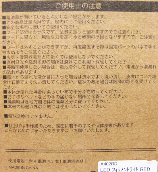 | 商品説明 | 伝統的なオイルランプの形が美しい、まるで童話に出てきそうなランタンです。 見た目はレトロですが、電球はLEDのエジソンバルブを使用。 優しく暖かみあるランプの光りは、まるで本物の火の光を思わせます。 キャンプなどのアウトドアはもちろん、火を使わない安全なLEDランタンはインドアでも活躍すること間違いなし! デザインだけでなく、停電時にも活躍する実用的なランプです。 普段はインテリアとしておしゃれに飾っておいて、いざという時に使えますよ! スイッチは底にあり、光量の調整は無くON/OFFの切り替えのみが可能です 少しくすみのある落ち着いたカラーも、アンティーク感があり魅力ですね♪。 ■ サイズ: Φ10.5×H21.8cm ■ 材質: アイアン・LED・ガラス ■ 使用電池: 単4電池×2本(別売/アルカリ電池推奨) ≪掲載写真について≫ 撮影環境やお客様のモニターなどの影響により、商品写真は 実際のものとは色や質感が異なって見える場合がございます のでご了承ください。 ≪送料≫ ●宅配便、全国800円(沖縄、北海道以外) 沖縄、北海道は1200円です。 ≪注意事項≫ 土曜、日曜、祝日はお休みさせていただきます。 (その他臨時休業の際は自己紹介欄に記入いたします。 発送、ご連絡等は翌営業日にさせていただきます。 ★自己紹介欄は必ずご覧ください★ ★その他商品も多数出品しています、 よろしければ、ご覧下さい。 ★同時落札は同梱対応OK!商品の大きさにより料金が異なります。 ★大型商品以外になります。 ●●●●●●●●●●●●●●●● 〒533-0004 大阪市東淀川区小松1-9-23 (株)ラヴィアンローズ 田中 TEL/FAX 06-6476-7822 ●●●●●●●●●●●●●●●● ウオッチリストに追加 |
