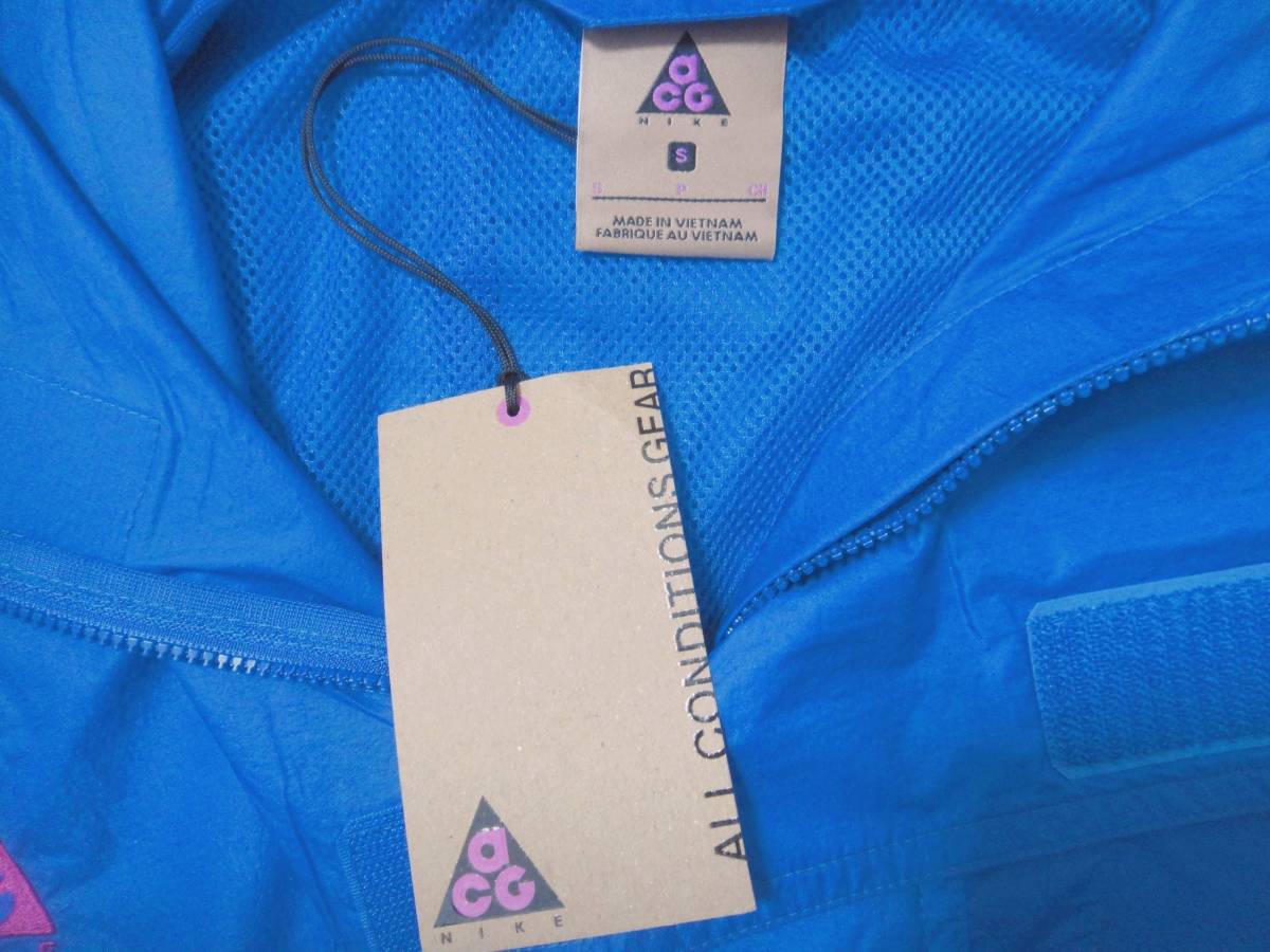NIKE(ナイキ)のナイロンジャケットです ■モデル名はAS M NRG ACG ANORAK HDです ナイキのアウトドアカテゴリーであるACG(ALL CONDITIONS GEAR)シリーズのものです ■新品未使用です タグも付いております(紙タグに少々ダメージがあります) ■サイズはSになります 素人採寸ですが 身幅(脇の下で)63センチ 身丈(正面側で)65センチ 身丈(背面側で)68センチ 裄丈88センチありました やや大きめの作りとなっております ■生地は100%ナイロンです 薄手でとても軽量に作られております 急な小雨に対応出来ます ■プルオーバーのスタイルです 胸付近までジッパーが付いております ■色は青とピンク系のツートンになります ■パッカブルです ジャケット本体を正面のポケットに折り畳んで収納出来ます 持ち運びに便利です カラビナが付いておりバックパック等に取り付ける事も出来ます ■正面にはさらにメッシュのポケットも付いております ■フードはドローコードで締めることが出来ます ■右胸にはNIKE ACGのマークが付いております ■1枚あると便利です ■是非よろしくお願い致します