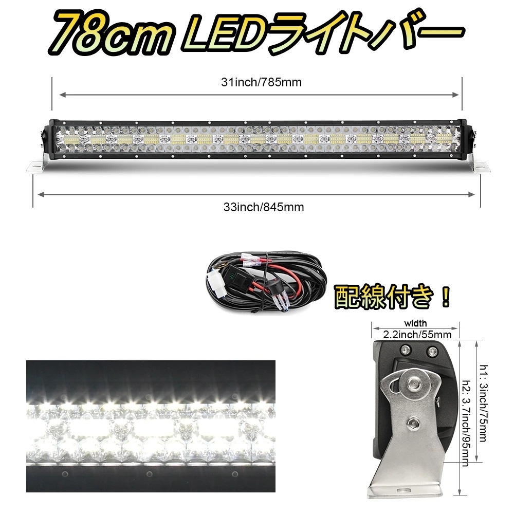 | 商品内容 LEDライトバー(78cm) ストレートタイプ 特徴 発光色:ホワイト 対応電圧:12V/24V 消費電力:585W 色温度:6,500K 防水・防塵性能:IP68 (防水/防塵ともに最高性能) 動作温度:-40℃~85℃ 動作寿命:50,000時間以上 全体サイズ:845mm 照明部サイズ:785mm 付属品:固定用ステー/配線 適合確認 タイトルの車種情報をご確認ください。 ※タイトルにある車種以外でも12V/24V車であればご使用可能です。 ※タイトル車種は弊社で12V及び24Vであることを確認した車種になります。 |