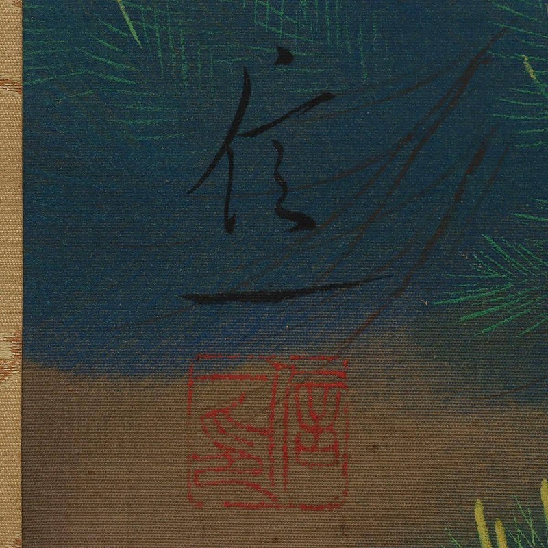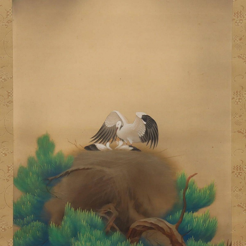 | JK15-9536[TOM]【真作】 山内信一 掛軸 絹本 肉筆 彩色「巣籠」 落款 印有 共箱(二重箱) 日本画 西山翠嶂師事 | |