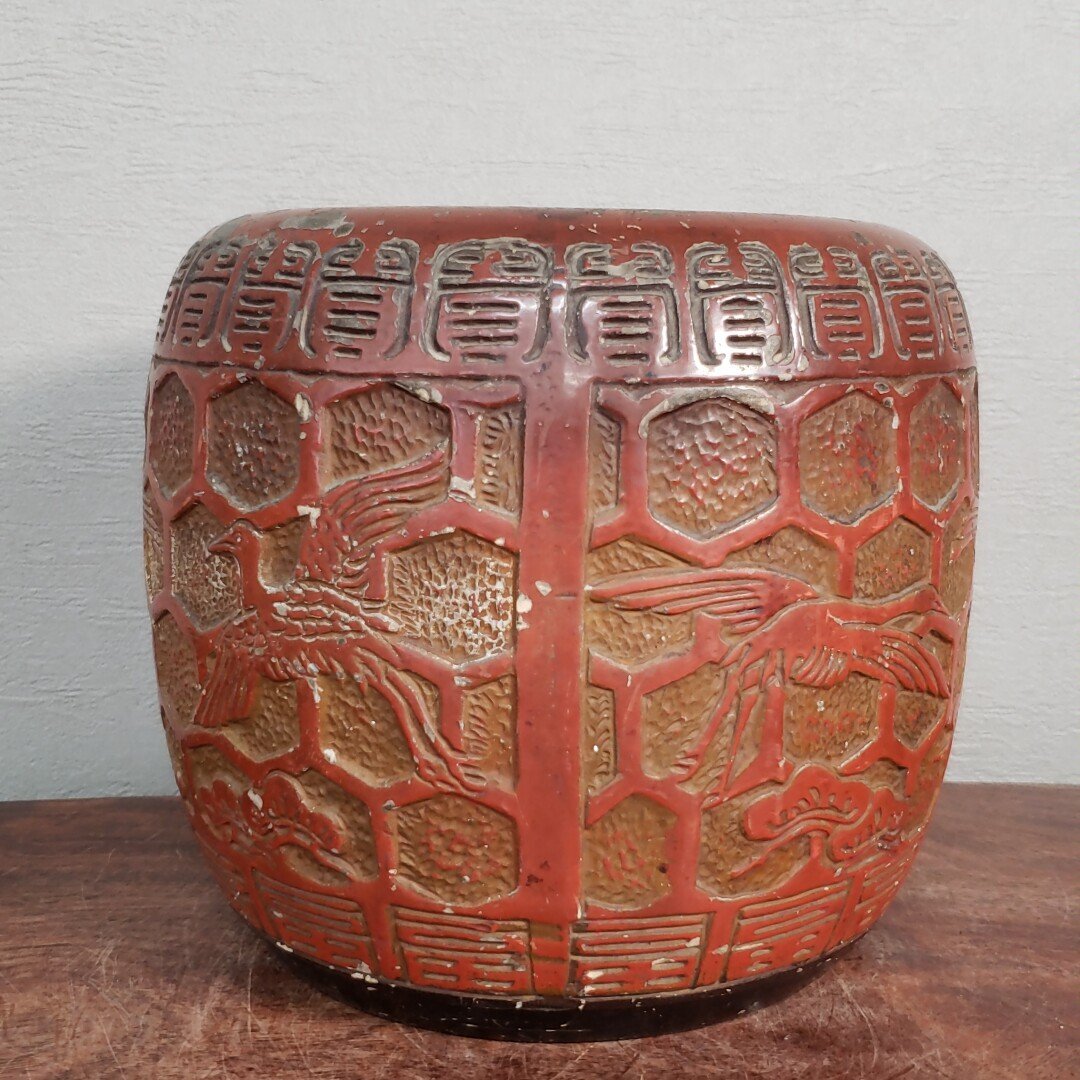 おめでたい柄の陶器製の火鉢です。プランターカバーとしてもお使いいただけると思います。