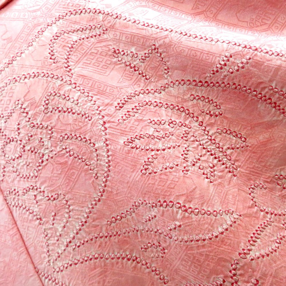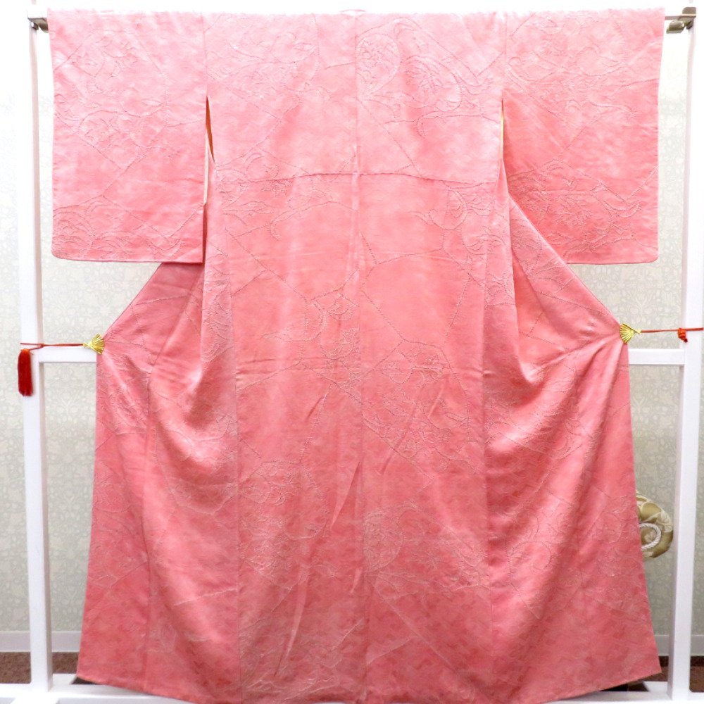 | 商品説明 | 普段づかいに便利な小紋きものです。ピンクのムラ染め調の地模様に有栖川文様が入り、裂取り調の柄や花の模様が絞りで表現された 手の込んだ大変オシャレな一枚です。 絞りの赤い差し色が効いてる様もステキです。 普段使い用のお着物をお探しの方・習い事のお稽古用や 着付けの練習用としてもオススメです。 名古屋帯や半幅帯と一緒にカジュアルコーディネートをお楽しみください。 | ||