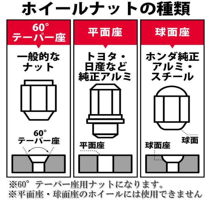 ※新品未使用品ですが、輸入商品の為、若干の小傷や汚れ等がある場合が御座います。 ※商品は60°テーパー座です、平面座・球面座のホイールには使用できません。 ※装着前に車両のボルト径・ネジピッチが合っている事をお確かめください。 ※ナットの締め付け順序は対角線状に締め付けて下さい。 ※ナットの締め付けトルクは、下記を参考にしてください。 ◎ネジ径M12 110~120N・m (11~12kgf・m) ◎ネジ径M14 140N・m (14kgf・m) ※あくまでも参考値です。メーカーの指定トルクを優先してください。 ※インパクトレンチの使用は、ナットの締めすぎや締め付け不足の原因になります。 ※締め付けは必ずトルクレンチにて指定トルク値で締め付けて下さい。 ※商品に初期不良があった場合は、速やかに代品をご用意させて頂きます。 ※取り付けや取り外しに関わる費用、代車費用、転売その他による第三者損害についての補填は致しかねます。 |
