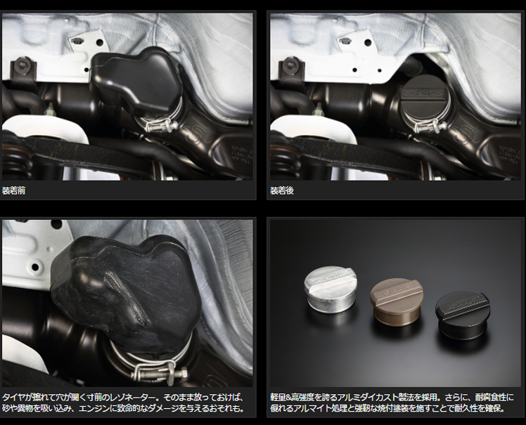 玄武 レゾネーターキャンセラー ERC03H ハイエース GDH200系 ディーゼル車 ◎ローダウン+ワイドタイヤ装着には必要不可欠! ローダウンしたらワイドタイヤの装着はあたりまえ。 タイヤが擦れて穴が開く前に重大なトラブルを防止。 ◎レゾネーターを取り外した穴に差し込むだけの簡単装着! 特別な工具を用意する必要がなく、ごく短時間の作業で装着完了。 ◎カスタムユーザーには嬉しい、レーシーな吸気サウンド! タイヤハウス内のスペース拡大と同時に心地よい吸気音もゲット。 ◎軽量でありながら、抜群の強度と耐久性を誇るアルミダイカスト製法! タイヤに付着した石や砂塵はもちろん、ときには雨や融雪剤などの攻撃に さらされるタイヤハウス。アルミダイカストのボディにアルマイト処理と 焼付塗装を重ねてコーティングすることにより、 長期間の使用にも耐える驚異的な耐久性を実現。