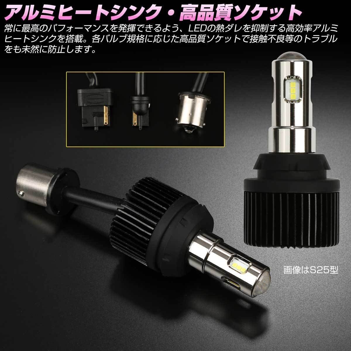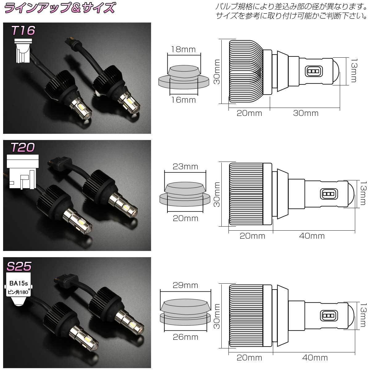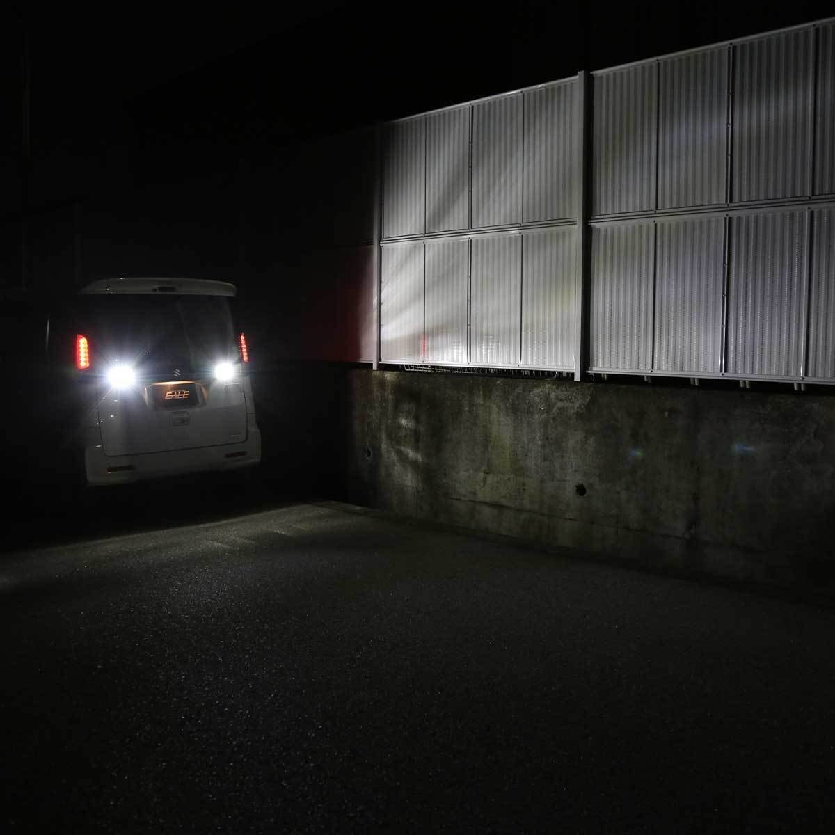 バックギアに入れた瞬間に目が眩む、圧巻の2600ルーメン超高輝度照射!! コンパクトボディにハイパワーチップを可能な限り詰め込み必要以上の明るさを実現。 フォグランプかと思うほどの強烈な光で後退時の視認性を確保します T16/T20/S25の3規格をご用意しています。 ご落札後の選択制ではありません。出品の適合規格を必ずご確認下さい。 | ■ LED バックランプキット ■ 動作電圧:DC12V ■ 消費電力:14W/個 ■ 適合バルブ規格:S25 BA15s 180度ピン ■ 光束:2600lm(2個合計) ■ 入数:2個セット 他のバルブ規格は⇒ こちら | |