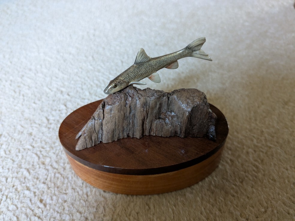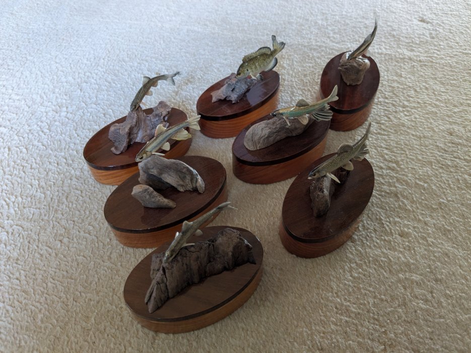 オイカワ・カワムツ・マルタ・ウグイ・ニゴイ・ハス・ブルーギルのフィッシュカービング。すべて手彫りでの制作で一般の方ではなくプロのフィッシュカービングの手によるもの。大きさは描5㎝ですが芸術性が極めて高くセットで購入されてお部屋に飾れば一層魚の魅力が引き立ちます。ちなみに新品価格は一体5万円。