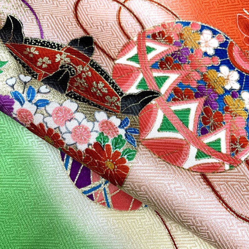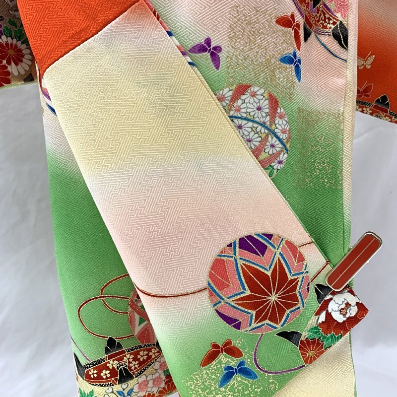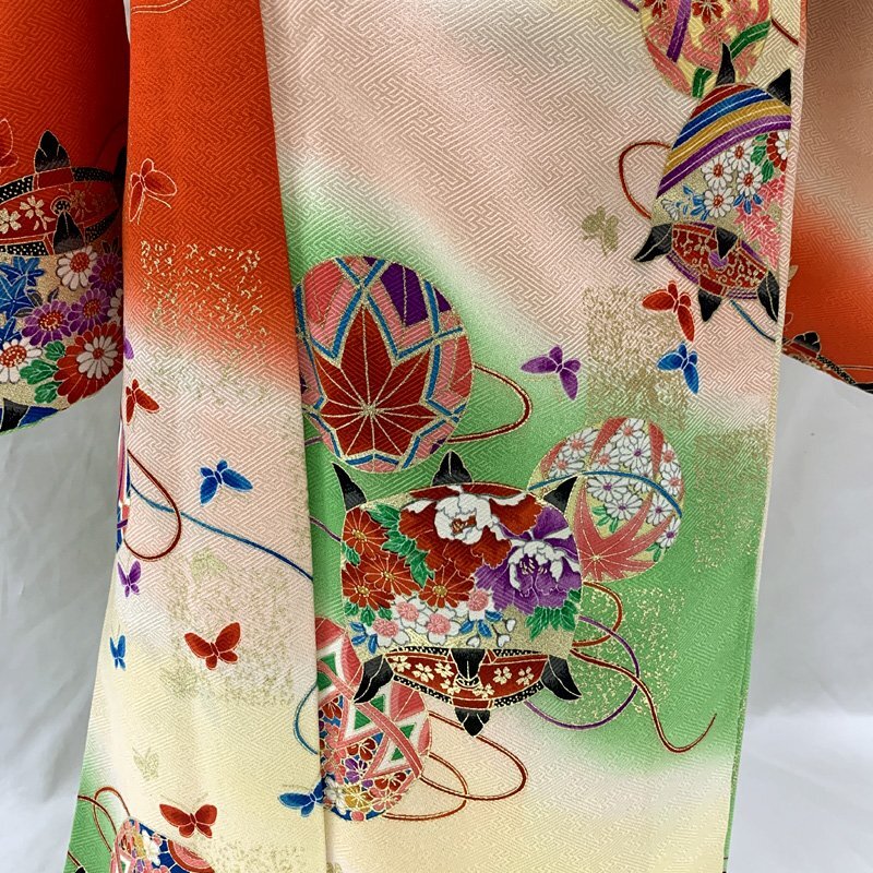 | □七五三 七歳 女児 着物&袋帯 金彩 毬 糸車 蝶 白黄緑朱色など□美品 (No.gd) *こちらの商品は、お着物と&袋帯のみです。白、黄緑、朱色、淡いピンクなどの地に、金彩が施された毬、糸車、蝶紋様が可愛らしい7歳七五三のお着物と袋帯のセットです(長襦袢はおまけでお付けしますが、その他の小物はセットに含まれません)。 袴と合わせてハーフ成人式や小学校の卒業式にもご利用いただけます。 中古のお小物類(帯揚げ、帯締め、しごき)は別途3000円、また追加で筥迫と末広は+3000円頂戴します。*お小物類のセレクトはおまかせとなります。 (着物)右前身頃の矢印部分にうっすら汚れ、左衽の内側にピンクっぽい色の跡がございますがどちらも着用時見えません。 (長襦袢)こちらには長襦袢が付属いたしません。代わりにお子様の負担が少なく、便利な子ども用楽々衿をお勧めします。#ag楽々衿 (帯)特に目立つシミやダメージはございません。 【表地素材】(着物)正絹、(帯)正絹 【色】白、黄緑、朱色、淡いピンクなど *モニターによって色味は実際と異なる場合がございます。 【サイズ】(着物) 裄:51cm、肩上げ:4.7cm、袖幅:32cm、袖丈:67.5cm、丈(肩から):129cm、腰上げ:0cm、前幅:20cm、後幅:26cm (帯) 幅:26.5cm、長さ:396cm *素人採寸のため、多少の誤差はご容赦ください。 お求め安い価格での出品ですので、いかがでしょうか? | |
