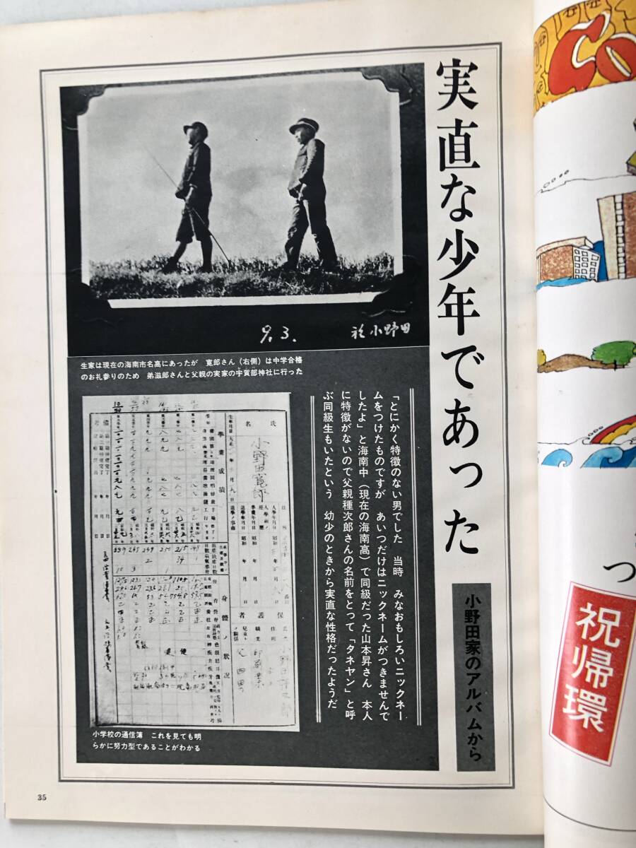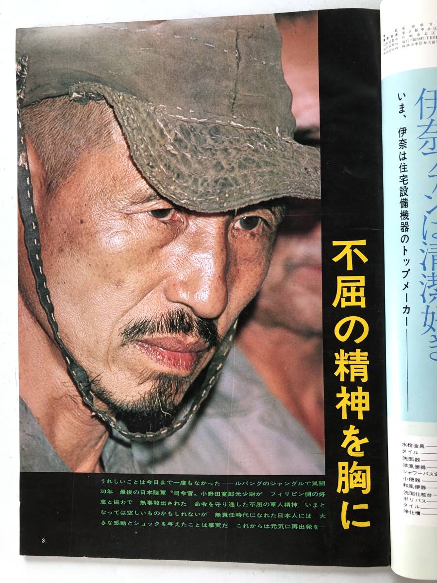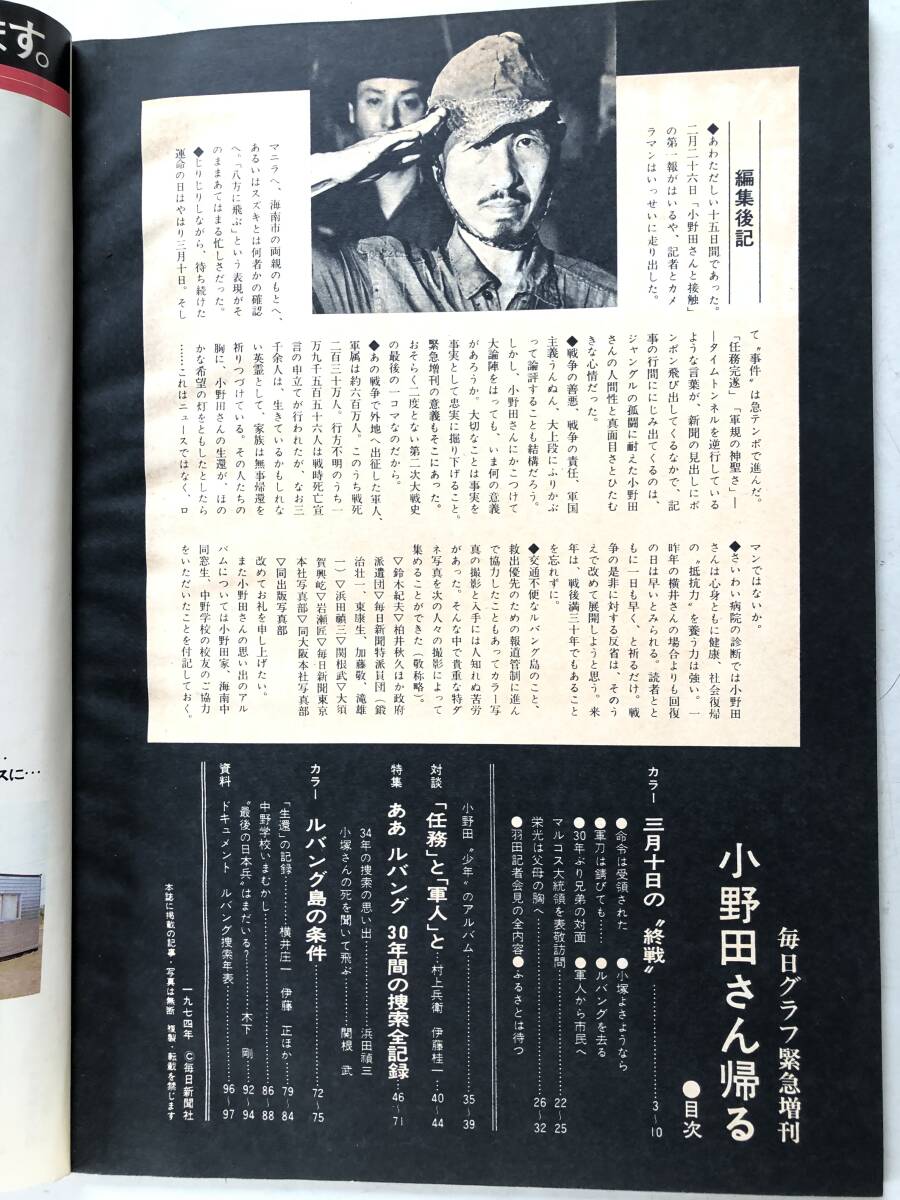 | 毎日グラフ 緊急増刊 1974 4/5 小野田さん帰る 全記録 ルバングから祖国へ 30年間の捜索のすべて 毎日新聞社 昭和49年 2510-C116-01M | |