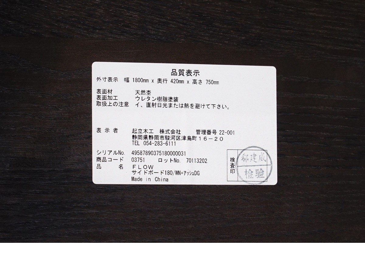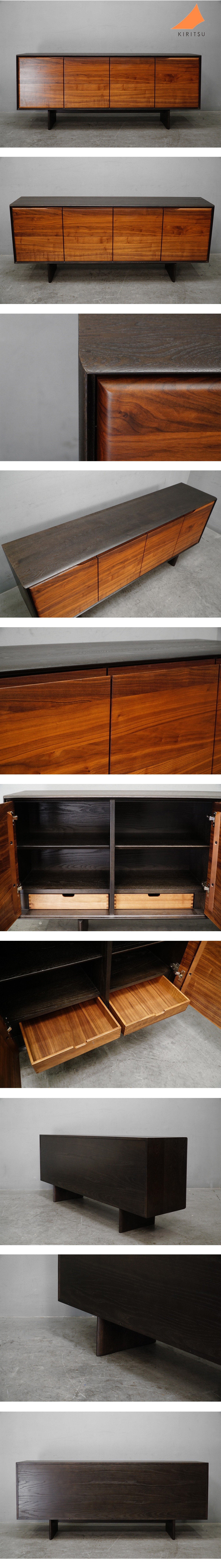 ◇日本を代表する木工ブランド、起立木工のFLOW(フロー) サイドボードです。 なめらかなフォルムが美しいFLOWシリーズ。扉前板は4枚の扉の木目がすべてつながる「通し目」を使用しており、まるで1枚の板のように見えます。扉内には5段階で可動する棚が付属します。下段には小物の収納に便利な引出しが。扉はゆっくりと閉まるソフトクローズ仕様です。主張し過ぎないデザインに、ブラックウォルナットとダークグレーの落ち着いた色合いで、様々なテイストにあわせることが出来ます。 参考までにブランドサイト(起立木工)をご覧ください。 参考新品価格(約):314,050円 |