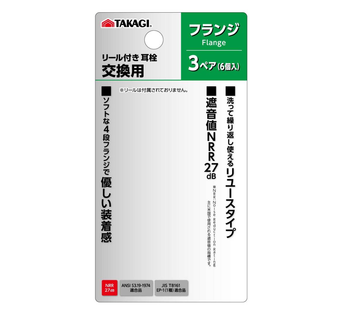 説明 リール付き耳栓の交換用 ※リールは付属されておりません。 ソフトな4段フランジで優しい装着感 洗って繰り返し使えるリユースタイプ 遮音値:NRR 27dB ※NRR:Noise Reduction Rating/主に米国で使用される遮音値の指標です ANSI S3.19-1974適合品 JIS T8161 EP-1(1種)適合品