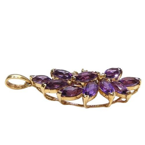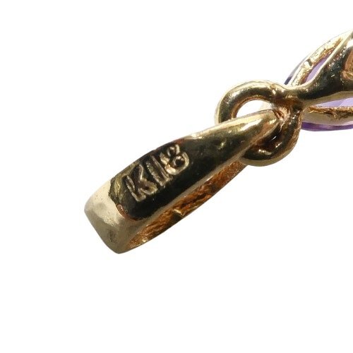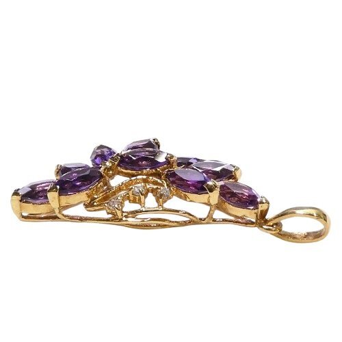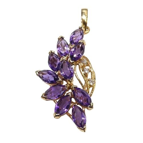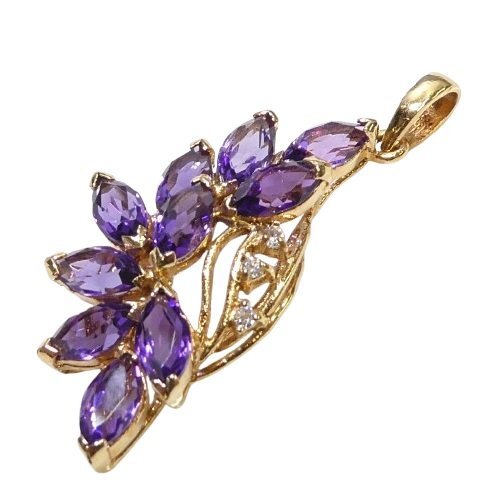 【商品説明】藤の花のような美しいデザインのペンダントトップ。さりげなく飾られたメレダイヤが輝きをプラスし、華やかな胸元を演出します。程よいボリュームで存在感のあるデザインです。【状態】微小キズ等ありますが輝きもあり綺麗な状態です。中古品につき、些細なダメージはご了承ください。【サイズ】・W 14.5mm・H 27.2mm・厚み:約 7.0mm・総重量:約 2.9g【カラー】画像でご確認ください【素材】・K18・アメジスト(カラット不明)・ダイヤモンド(カラット不明)【仕様】・刻印:K18【付属品】なし※鑑別書・鑑定書は付属しておりませんのでご了承ください※7枚目画像のチェーンは撮影用備品で商品に含まれません【商品番号】1621_9【注意事項】※商品の状態、色味などは当店の判断によるものです※あくまでも中古品につき、些細なダメージや見解の相違による返品はお受けできません※サイズはすべて平置きでの実寸です。多少の誤差はご了承ください※気になる点がございましたら、入札前にお問い合わせください※お取引に関する詳細はストア情報でご確認くださいこちらの商品は【ネコポス】での発送が可能です※ポスト投函・簡易包装での発送・日時指定不可・同梱不可※紛失・破損に対する補償金額は3,000円(税込)まで予めご了承の上、ご選択ください