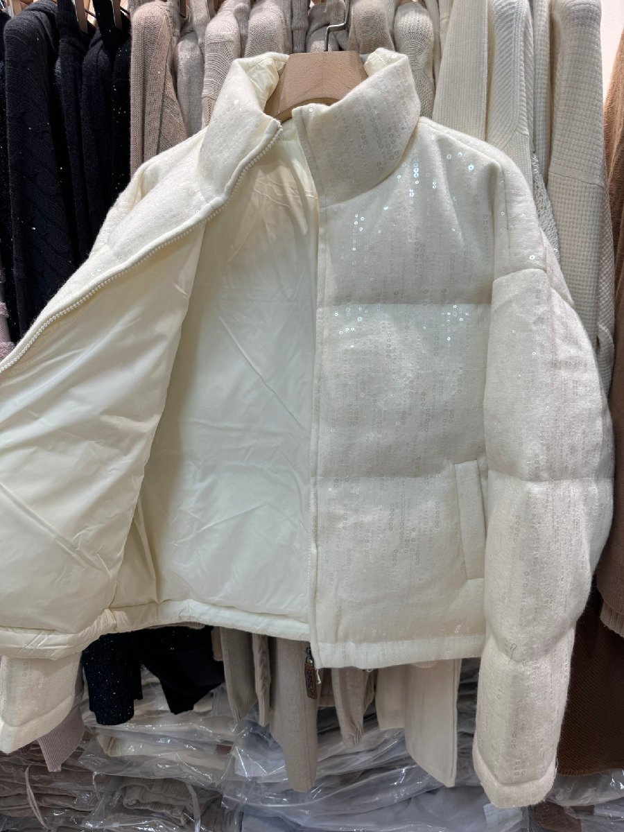 贅沢なカシミヤニットとダウンの組み合わせが魅力的なショート丈ジャケットです。全体に散りばめられたスパンコールが上品な輝きを放ち、特別な存在感を演出します。ホワイト、ベージュ、ダークグレーの3色展開で、それぞれに異なる魅力があります。軽量で暖かいグースダウンを使用し、カシミヤニットの柔らかな肌触りと相まって、極上の着心地を実現しています。フロントジッパー仕様で着脱が簡単です。スタイリッシュなシルエットながら、ゆったりとした着用感で体型を選びません。光沢のあるスパンコールデザインは、カジュアルからドレッシーなコーディネートまで幅広く活躍します。寒い季節のワードローブに、華やかさと実用性を兼ね備えた一着として、大切に着用いただけます。| 出价者 | 信用 | 价格 | 时间 |