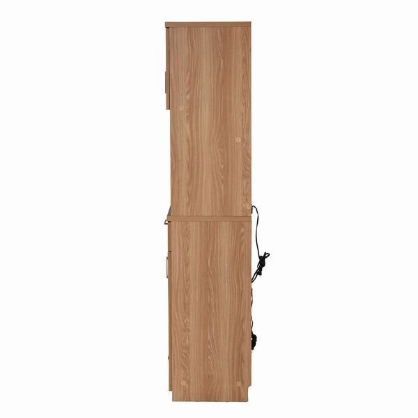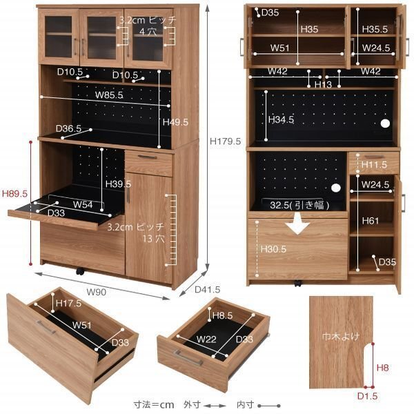 【サイズ】 <外寸> 幅90×奥行41.5×高さ179.5cm <内寸> オープン部:幅85.5×奥行36.5×高さ34.5(最大49.5)cm 上部左上扉内:幅51×奥行35.0×高さ35.0cm 上部右上扉内:幅24.5×奥行35.0×高さ35.5cm 下部右下扉内:幅24.5×奥行35.0×高さ61cm 下部右上引出し:幅22.0×奥行33×高さ8.0(有効11.5)cm 下部左下引出し:幅51.0×奥行33×高さ17.5(有効30.5)cm スライド部:幅54.0×奥行33×高さ39.5cm スライド引き幅:32.5cm オープン部天板:幅85.5×奥行36.5×高さ89.5cm 奥固定棚:幅42×奥行10.5×高さ13cm 上部左上扉内可動棚:幅56.5×奥行35.0×厚み1.5cm(3.2cmピッチ4穴) 上部右上扉内可動棚:幅27×奥行35.0×厚み1.5cm(3.2cmピッチ4穴) 下部右下扉内可動棚:幅27×奥行35.0×厚み1.5cm(3.2cmピッチ13穴) 幅木避け:奥行1.5×高さ8.0cm 【耐荷重】 引出し大:(約)10kg以下 引出し小:(約)3kg以下 スライド棚:(約)5kg以下 棚 大小:(約)5kg以下 奥固定棚:左右で計(約)5kg以下 オープン部天板:(約)15kg以下 【材質】 本体:プリント紙化粧合板 【生産国】 マレーシア 【梱包】 2梱包でお届けします。 2-1 サイズ:97.5×44×17cm、重量:25kg 2-2 サイズ:99×44×22cm、重量:37kg 【その他】 ・可動棚:4枚 ・合計1500W2口コンセント付/コード長さ180cm ・キャスター1個 【組み立て品】 お客様による組み立てが必要です。 |