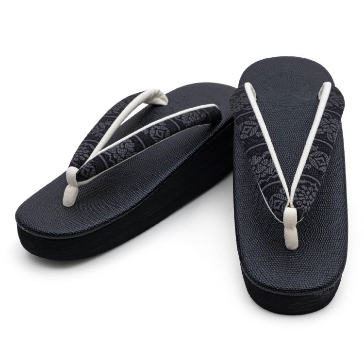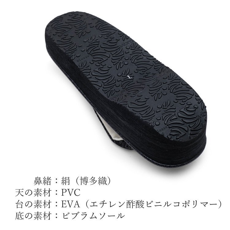 | 素材 | 鼻緒:正絹 天:PVC(ポリ塩化ビニル) 台:EVA(エチレン酢酸ビニルコポリマー) 底:ヒブラムソール |
