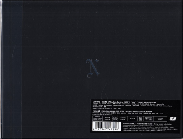 【内容】 有明アリーナで開催された自身初のソロアリーナライブ映像を収録! 【収録内容】 DISC-1 1)ピカレスク 2)N / o’clock 3)ヒトゴト 4)黄昏てゆく夜に 5)Teleportation 6)Bye Bye Me 7)SHE IS...LOVE 8)Scene29 9)Jasmine Tea 10)ROSSO 11)jealous 12)Mr.Jealousy 13)Dance on the floor 14)Nocturne 15)THE CODE 16)ファタール 17)カレカノ!! 18)Love風 19)Hey!! Summer Honey 20)Black Cinderella 21)迷夢 22)CANDY Can U be my BABY 23)Unite 24)RUN DISC-2 1)N / o’clock 2)jealous 3)ヒトゴト 4)黄昏てゆく夜に 5)ピカレスク 6)Raise Your Light 7)Unite 8)Bye Bye Me 9)迷夢 10)THE CODE 11)CANDY Can U be my BABY 【特典内容】 豪華BOX仕様/Nカード「KENTO NAKAJIMA 1st Live 2025 "N / bias" Limited Edition」 3種 | |||||||||||||||||||||||||||||||||||