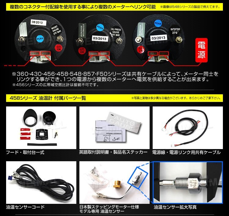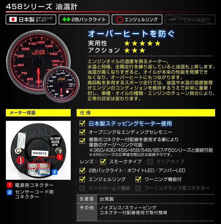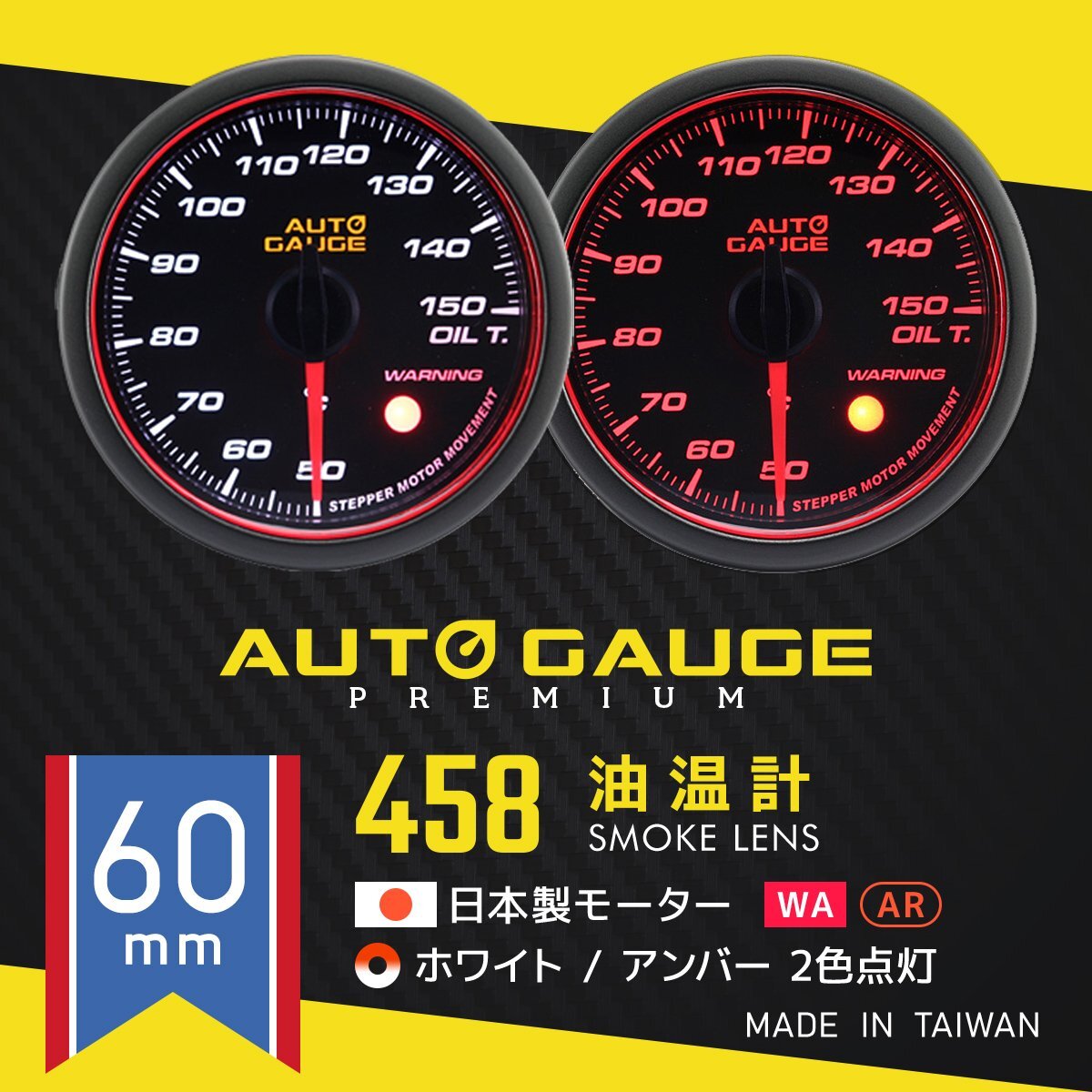 日本製ステッピングモーター搭載 オートゲージ プレミアム 458シリーズ 油温計 60mm 点灯色: ホワイト / アンバー ワーニング機能付 エンジェルリング機能付(文字盤周囲が赤く円状に発光) |
