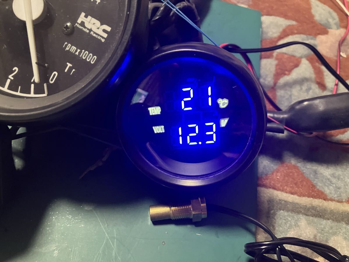 実際にこちらを組み込まれたお客様より、「デジタル水温/電圧計があったおかげで走行中突然の電圧の異常上昇を早急に発見することが出来、レギュレータの故障によるPGMのパンクを未然に防ぐことが出来た」とご連絡を頂きました。細かい部分ですがTEMP、VOLT等の文字もライトオンで点灯するようになっております。