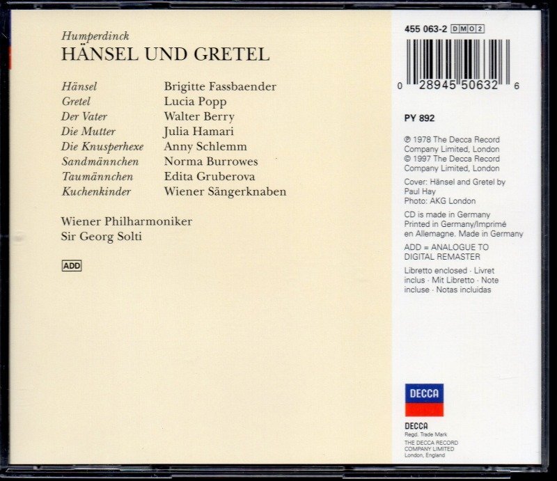 -ショルティの指揮は硬派ながら、このメルヘン・オペラに似つかわしくないほど厳しいものではなく、むしろウィーン・フィルの有機的で、豊かな響きとともに充実した演奏を聞かせてくれます。ファスベンダーとポップの歌も実に見事。子供に化けることを意識した歌ではなく、音楽的な充実を感じます。-ショルティ&WPはこの後 1981年 当オペラの映像作品を作っています。ファスベンダーとバロウズは同役、グルベローヴァはグレーテルを歌いました。