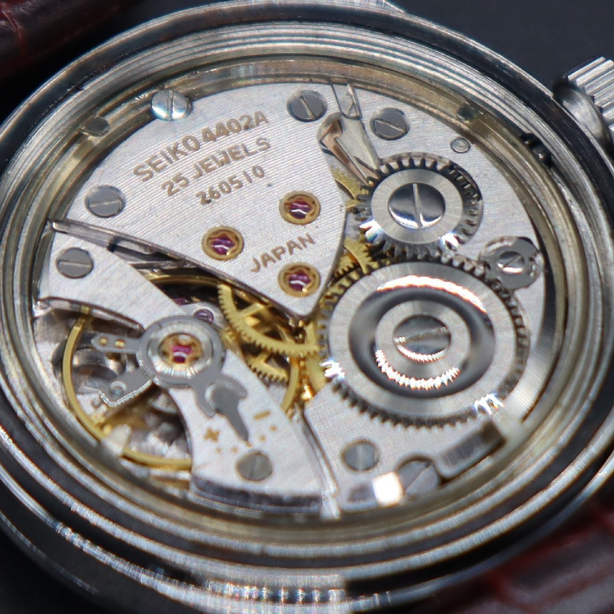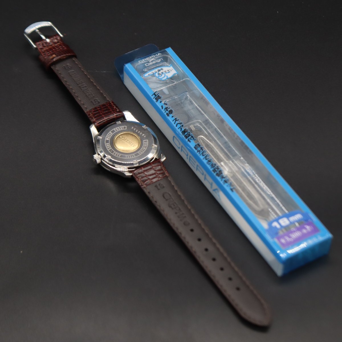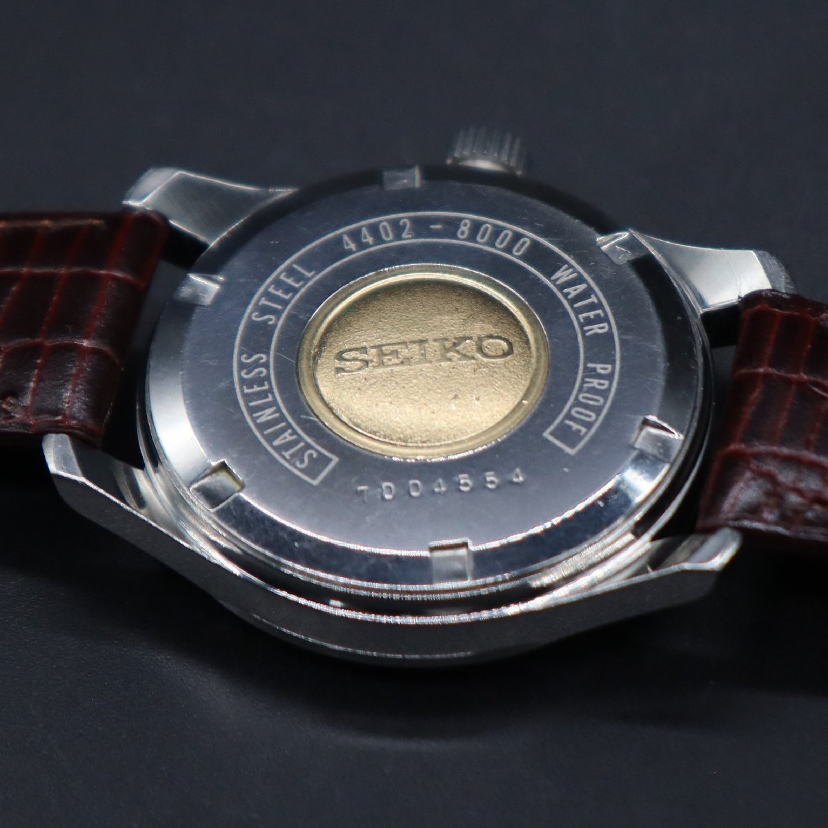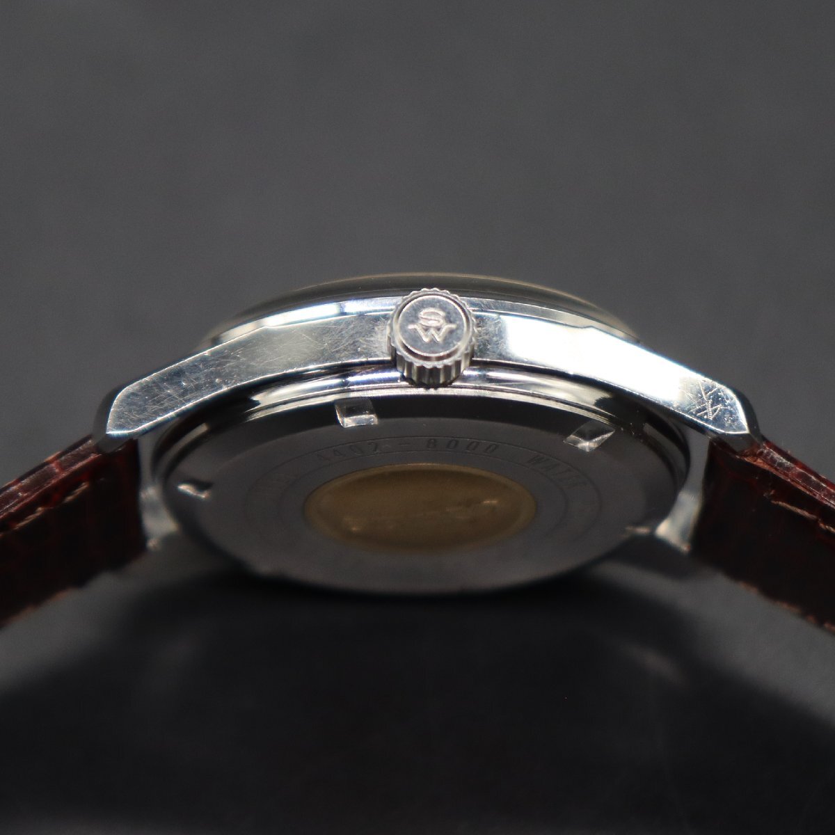 平置きで12時間動作確認済み、大幅な遅れなく稼働中です。 リューズ巻止まりOK、一段引きで日付早送り、 二段引きで時間調整が可能です。 ハック機能良好、巻き上げ感も軽快です。 ※カレンダー早送り機能は、商品同封の「使用上の注意」を必ず守り、 丁寧に、やさしく操作していただくようお願いいたします。 古いお品物ですので、ケースやベゼル全体に経年の細かな傷やスレ、 文字盤に微細なチリ汚れと5時付近に傷みが見受けられますが いずれも目視で目立つ程ではなく、ダイヤルのきれいなお品です。 植字ロゴ・針・インデックス、いずれも良好です。 SWマーク付きリューズ、状態良好です。 裏蓋のSEIKOメダリオン、目立った傷みなく良好です。 周囲の刻印も鮮明です。 ベルトは、新品の国内メーカー製革ベルトに交換済みですので すぐにお使い頂けます。 経年から考えて状態が良く、良品といって差し支えないお品かと思いますが あくまでもアンティークでございます。状態については画像にてご判断願います。 |