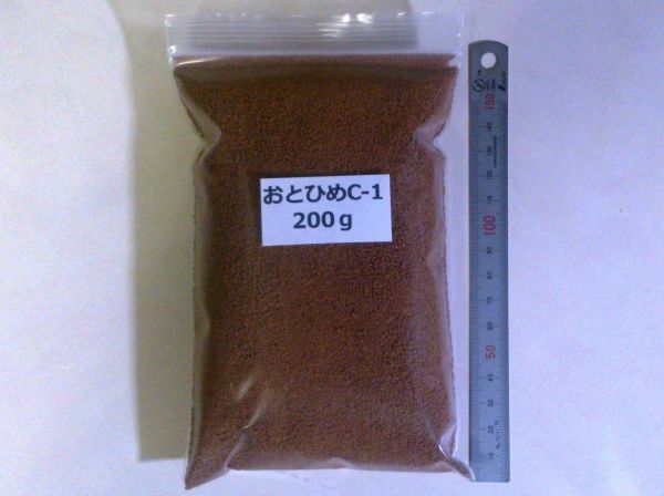 おとひめC1(0.6~0.9mm)200gの出品です。 日清丸紅飼料製の、海産魚養殖用として開発された飼料で淡水魚の飼育においてもとても栄養価が高く嗜好性に優れた餌です。 多くのブリーダーの方にも利用されている高級飼料です。 当方でも使用していて、らんちゅうの赤虫を食べ始めた頃の餌として使用しています。 小分けしてチャック付きポリ袋(0.08mm)に入れて封筒に梱包し「クリックポスト」にてお届けします。 他商品との同梱発送も可能です。 【成分量】 ・粗蛋白質 50.0% ・粗脂肪 10.0% ・粗繊維 3.0% ・粗灰分 17.0% ・カルシウム 2.0% ・りん 1.5% 【動物質性飼料】 ・オキアミミール、魚粉、馬鈴薯澱粉、小麦粉、精製魚油、 リン酸カルシウム、植物性ガム物質、ベタイン、肝臓抽出物、各種ビタミン等 【対象魚】 グッピー・メダカの成魚 らんちゅう・オランダの肉瘤増強 錦鯉・コリドラス・プレコなど | |
