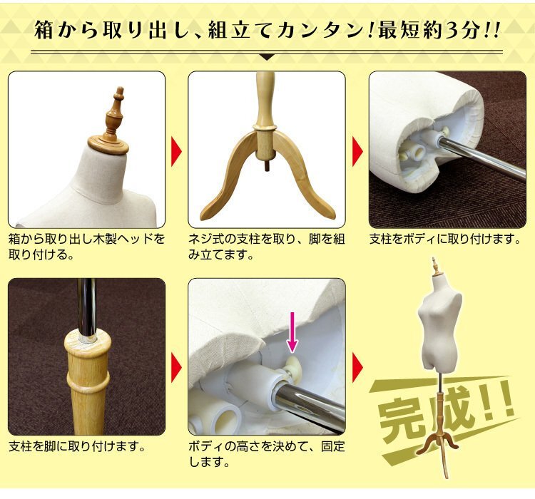 ショップのディスプレイやお部屋のインテリア、オークションや フリマアプリでの洋服モデルとしても大活躍! 組立も簡単! ボディと支柱を取り付けるだけなので最短3分ほどで完成します! 2穴式なのでパンツ・スカートどちらでも対応! また、トルソーの内部はFRP素材を使用しているのでとっても丈夫かつ高品質! 外張りの布は上質リネン生地なのでとても柔らかく上品な肌触りです。 針止めは出来ませんが、仮留程度であれば布をすくうように刺すことが出来ます。 【商品仕様】 サイズ(約):肩38 B86 W64 H84 素材:FRP素材、リネン、スチール ※輸入品となりますので、えくぼ傷、擦れ傷や倉庫保管時に生じた小さな汚れ がある場合がございます。 ※脚の部分は天然木を使用しており、表面にニスが塗られておりますが多少の傷が ございます。 【もちろん新品未使用品です】 |