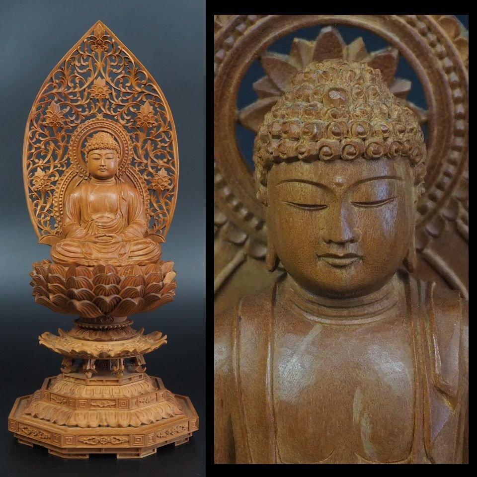 | 商品説明 | 高さ約 23cm 幅約 10×10cm 重さ274g 白檀について 白檀はさわやかな甘い香りを持つ香木として知られ、 貴重な香木として扱われるほか、薬用にも広く利用される。 また、気分の薬として胸のつかえをとり、爽快感を与え、 精神的なストレスや不安症などをやわらげる。 近年はインド政府による伐採制限と輸出規制により世界的な品不足で激減をし、 日本にはおもに彫刻美術品などの加工品や香料など粉末にされたもの以外輸出がされないため、 大変希少となっています。 ご覧のように、見事な香木白檀細密彫刻如来坐像です。本物保証です。状態がとてもよい、詳しくは写真でご確認ください。 |
