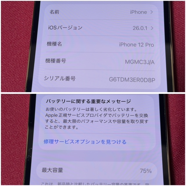 | お譲りいただいたお品物になります。 ◆商品名◆ ※30683 iPhone12Pro SIMフリー 256GB BT75% 白ロム MGMC3J/A 本体 ゴールド ◆IMEI◆ 356686112284035 ◆制限◆ ネットワーク利用制限:- (SIMフリー品) アクティベーションロック:解除済み ◆詳細◆ 使用されていた中古品です。 全体的にキズ、汚れ等ございます。 画面に目立つキズは見受けられないかと思われます。 スピーカー部分、隙間、側面にキズ、汚れが付いています。 (写真2.8.9.10にてご確認ください) バッテリーは最大容量75%と劣化が進んでいます。 画面タッチ、物理ボタンの動作は特に問題なさそうです。 初期化した状態でお送りします。 ◆出品者における保証対応◆ 「確認済み」と記載した動作に不具合があった場合は ・商品到着から3日以内 ・発送方法「ゆうパック」ご利用時 上記要件を満たしている場合に限り、返品・返金にて対応させていただきます。 4日目以降は一切対応いたしませんので、必ず3日以内に商品の確認をお願いいたします。 ◆その他◆ 詳細は画像にてご確認いただき、ご自身でご判断をお願いします。 個人保管のため、神経質な方のご入札はご遠慮ください。 商品は現状(出品時の状態)でのお渡しになります。 |
