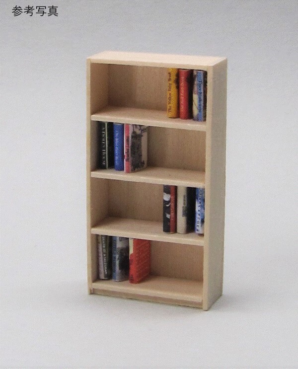 24分の1サイズ、ミニチュア本棚、サイズ約高さ5×幅2.7×奥1.1cm、木製(バルサ材)無塗装です。参考商品の豆本は含まれません。本棚のみの販売です。ストア、併売品。