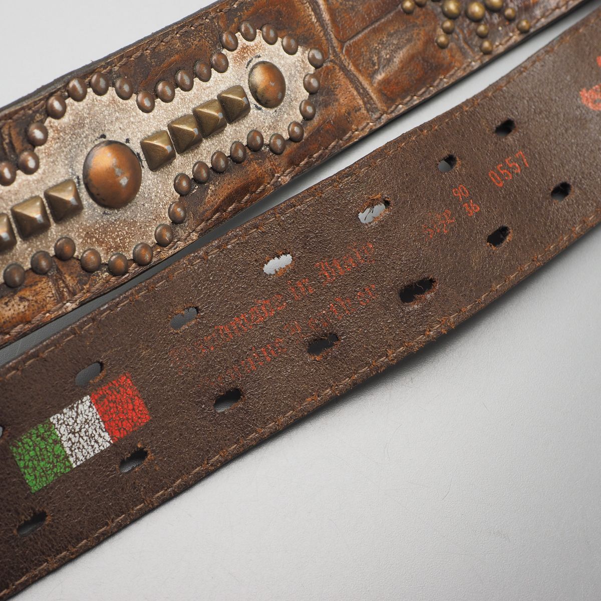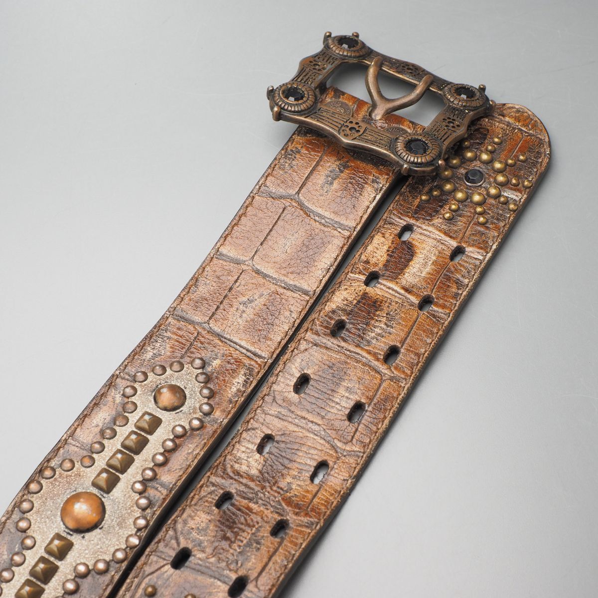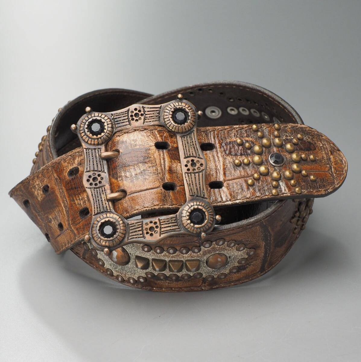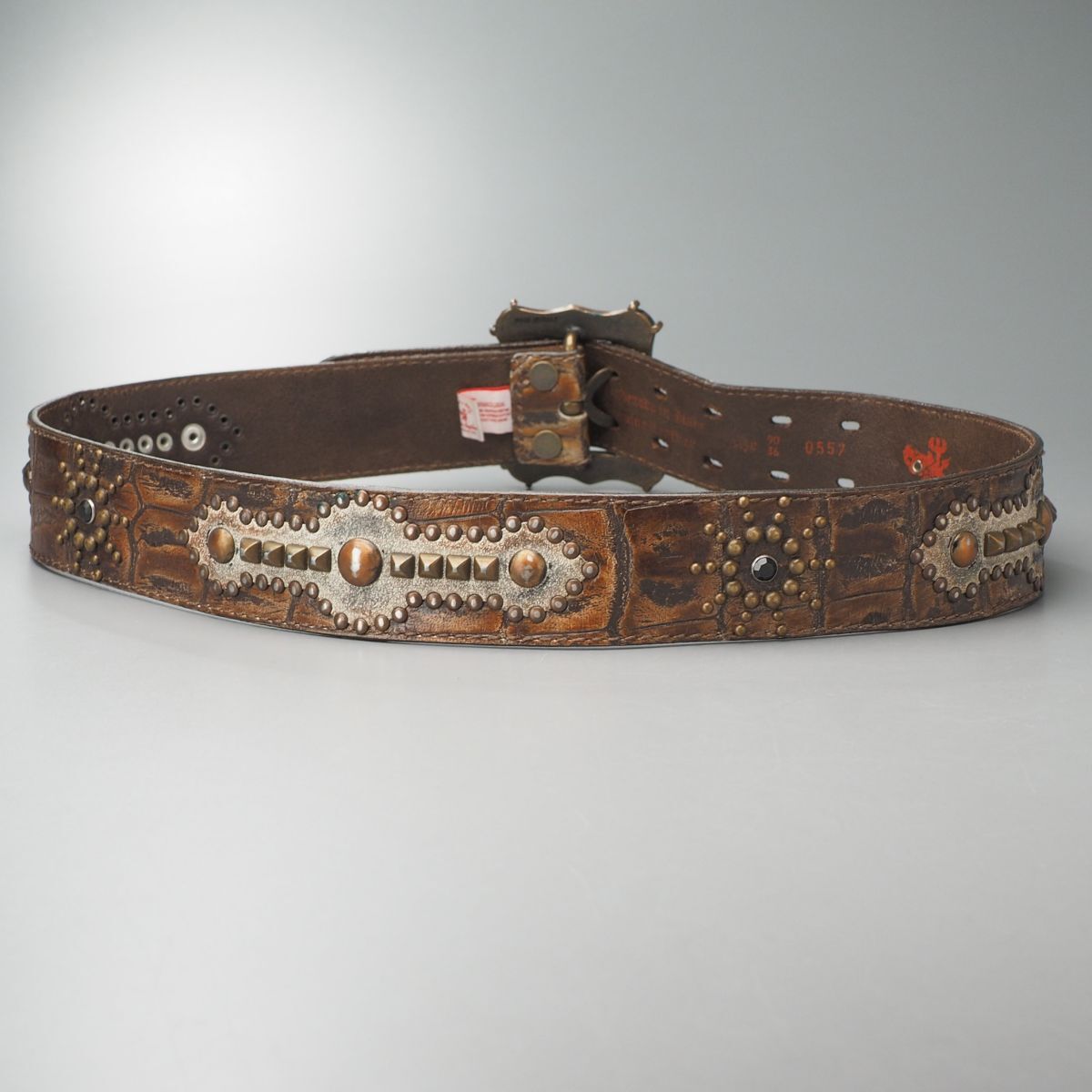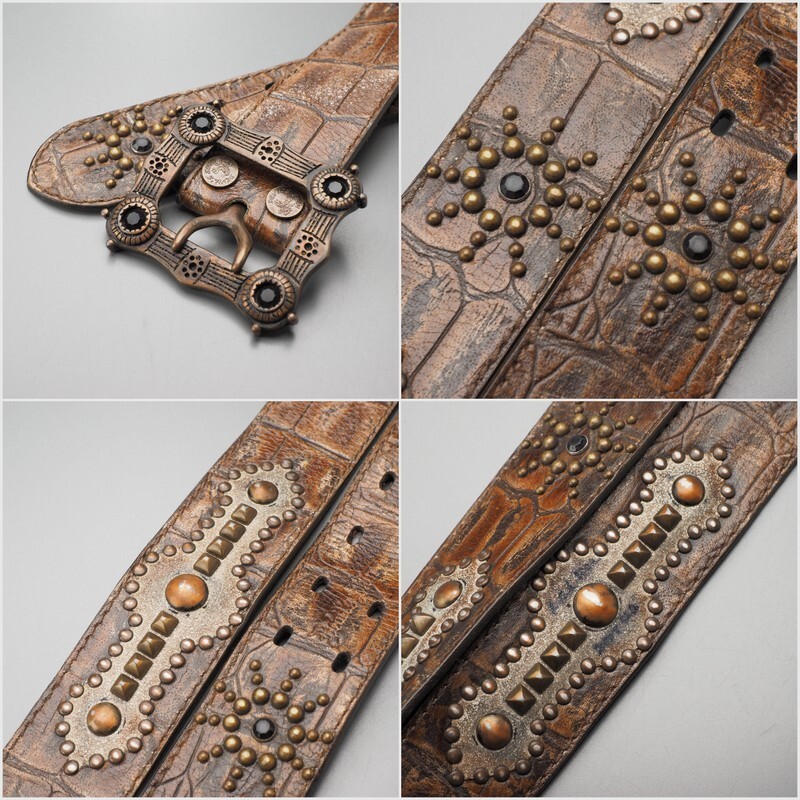 | TJ6541◎Devil's Skin Leather Belt Studs Y2K Archive Brown Ornate Buckle 伊製 メンズ レザーベルト スタッズ クロコ型押 90/36 茶 | |||