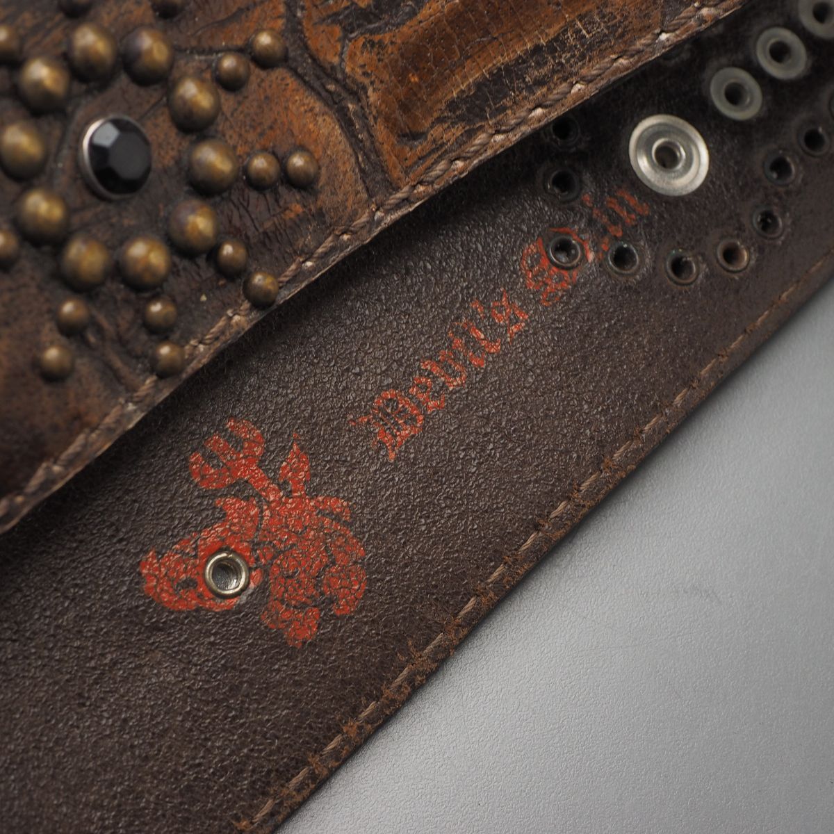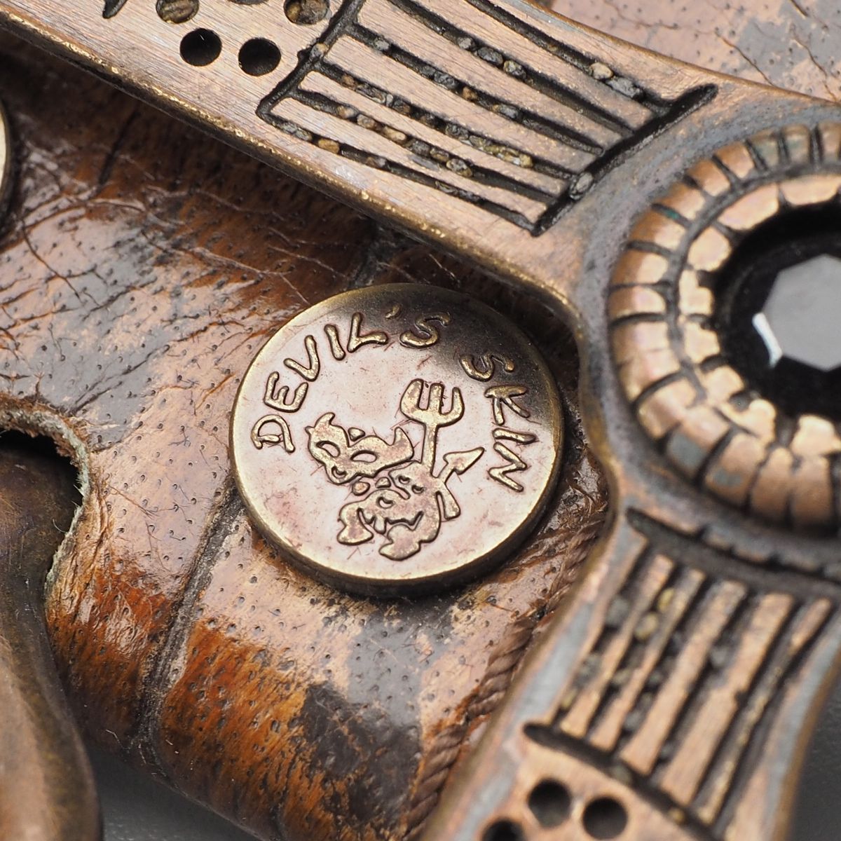 アンティークゴールド系のスタッズやビジュー等が映える『Devil's Skin』のレザーベルトです。