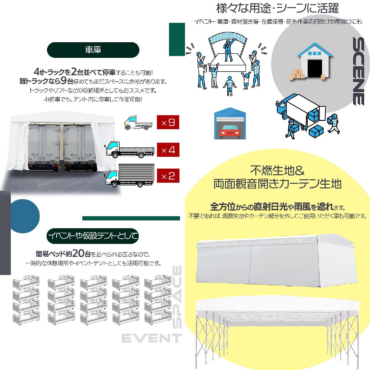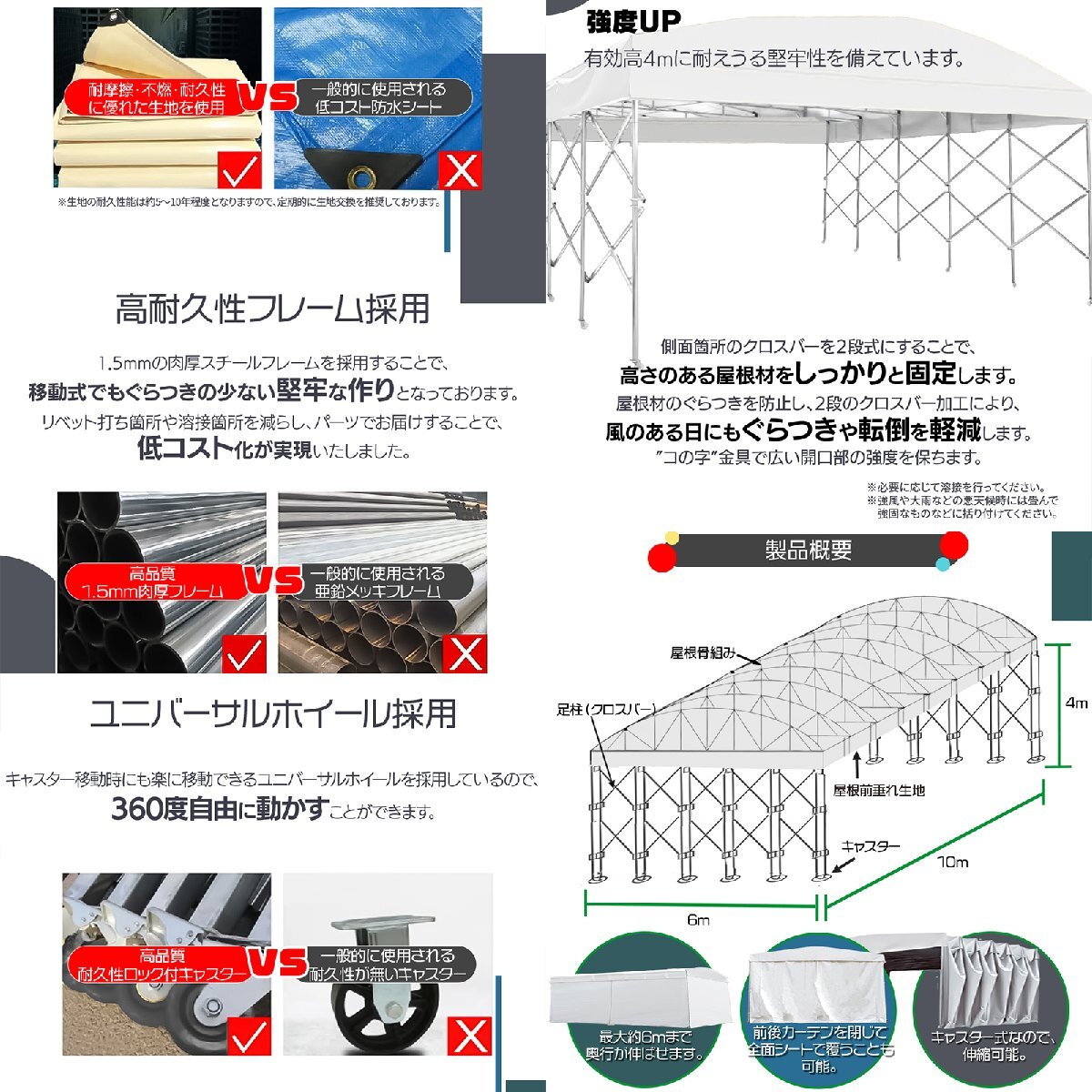| 内容品 | 屋根生地/側面生地/カーテン生地/屋根前後垂れ生地 足柱(キャスター付き)/屋根骨組/ボルトナット カーテン用ワイヤーケーブル/タッピングビス/ 取扱説明書 |