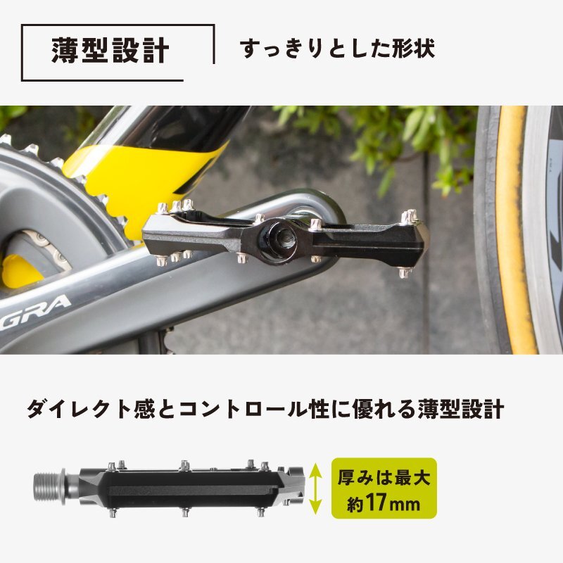 街乗りらしいカジュアルなデザイン。幅広設計で漕ぎやすいペダル。 クロスバイク、マウンテンバイク、ロードバイク、ミニベロ、電動自転車などに最適なマルチペダル。 通勤や街のり、ツーリングなどにも使える実用的なフラットペダルです! 大胆に肉抜き加工が施された形状で軽量で丈夫なアルミ素材を採用。 CNC加工で表面がスムーズで傷がなく、耐摩耗性、耐腐食性がよいです。 踏みやすく食いつきがスパイクピンはしっかりと靴下をホールドします。 3ベアリングは滑らかで高い回転性を実現。 [フラットペダル] シンプルでどんな自転車にもマッチするマットブラック。 カジュアルで街乗りらしいペダルです。 [滑り止めピン] 片面に7個ピンを設置し滑り止め効果を発揮します。 ピンはペダルの踏み込み位置に設置しています。 通常のピンの無いペダルより喰いつきがよく踏みやすくなります。 [踏み面は幅広] 安定性を向上させるため幅広でワイドな踏み面。 靴との接触部分が広くしっかりと足をホールドし漕ぐ力を逃さない。 しっかり体重を乗せられるので効率の良いペダリングが可能。 ペダルの安定感やグリップ力などを十分に発揮。 [ベアリング3つ] 3つのベアリングが内蔵されていて非常に滑らかで高い回転性を実現。 優れた耐久性を持ち、摩擦を最小限に抑えるので回転が滑らかで漕ぎやすい。 また密封されたベアリングは水やほこりの侵入を防ぐ。 ペダルはスムーズに回り効率の良いペダリングに。 [軽量] ボディは大胆にくり抜いて軽量化を実現。くり抜き部分が多くて汚れも付着しにくい。 見た目もスッキリして重さを感じさせずスマートな印象を与えます。 [耐久性] アルミ合金素材のフラットペダルは耐久性が良く錆びにも強い。 CNC加工で耐摩耗性、耐腐食性がよいです。 とても実用的なフラットペダル。 [様々な自転車に] 標準の9/16 インチのネジ径で様々な自転車に装着可能。 ロードバイクやクロスバイク、MTB、ミニベロやピスト、ままちゃり、電動自転車に。 六角レンチ(8mm)もしくは自転車のペダルレンチで脱着できます。 商品内容自転車用フラットペダル左右セット サイズ長さ100x幅104x厚み最大17mm、軸長60mm 軸径標準9/16インチ(ネジ径 約14.3mm) 重量約336g/ペア 材質アルミ合金本体、クロモリ鋼軸 ベアリング密封3ベアリング ※使い始めのペダルは回転が渋くなっている事がございます。特に冬場は内側のグリスが硬くなり、通常より渋くなってしまいますが ご使用されるうちに馴染みが出て軽くなります。 商品は入荷によりキズがある場合があります。 傷や細かい汚れが気になる方や神経質な方は入札をお控え下さい。 入荷時期により予告無く一部仕様変更する場合が有ります。 カラーはディスプレイ種類環境等により実物と異なって見える場合がございます。 |
