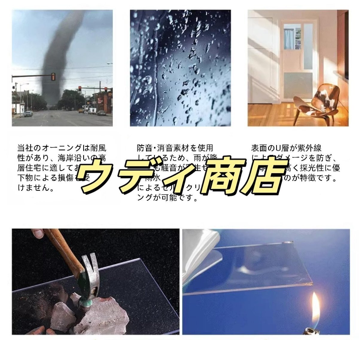 屋外の日よけは複数のグループに拡張でき、バルコニー、デッキ、正面玄関、裏庭、出入り口、中庭に水が溜まらないようにするために使用できます。また、ドアの前のメールボックス、モニター、充電ポートなどを保護することもできます。プラスチック鋼と比較して、当社のアルミニウム合金ブラケットはより耐久性があります。三角形の定理を採用して、より堅固で安定したものにします。表面は高温塗料で処理されており、耐老化性、耐食性があり、変形しにくく、に耐えることができます。耐久パネルの表面にあるUV層は紫外線を遮断し、自然光を浄化することができ、純粋な光を通すことができる。曲線的なデザインは、天蓋が時間内に排水し、水が溜まらないようにし、物干し竿のジャッキは、衣類乾燥のニーズを満たすために設計されている。サイズ:60*60cm , 60*80cm , 60*100cm , 60*120cm , 80*80cm , 80*100cm , 100*100cm , 120*120cm , 60*180cm , 60*200cm , 80*120cm , 80*180cm , 80*200cm , 60*300cm , 80*300cm , 100*300cmパネル材質:PCシートバー材質:アルミニウムブラケット材質:ABSプラスチックオーニング形状:スロープインストールが必須:はいパッケージ内容1×PCシートアフターサービスカスタマーエクスペリエンスを重視しています。ご不明な点がございましたら、時間内にお問い合わせください。喜んでサービスを提供いたします。