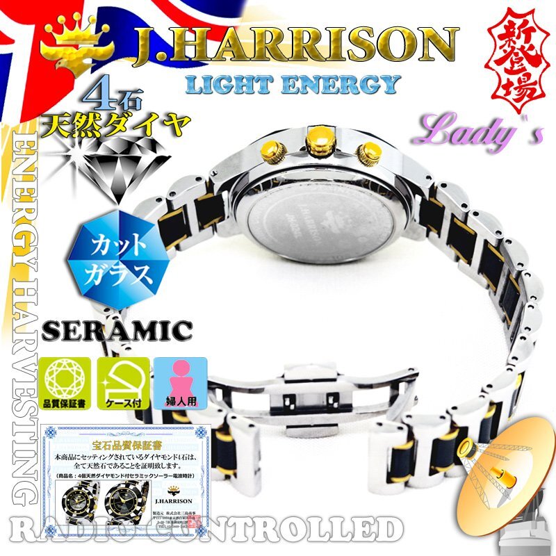 | 日本標準時を受信して自動的に時間補正する、とてもエコで地球にやさしい腕時計。 動きに合わせてキラキラ輝く「8面カット」のクリスタルガラス風防+セラミック製のカッティングベゼル+ ■定価:65,780円 ■仕様: ・ムーブ/ソーラー光発電+電波受信 ・ソーラーセルパネル/日本製光発電パネルを使用、電池交換不要 ・機能/電波受信(定時受信、リセット受信、強制受信、スリープ機能) ・受信電波/福島送信所40KHz・佐賀送信所60KHz、 両局自動選局受信(1日最大3回) ・日常生活防水 ・月差/±30秒(電波非受信時) ■素材: ・ケース&ベゼル:ステンレス+セラミック ・バンド:セラミック&ステンレス ・裏蓋:ステンレス&ガラス :ガラス:カット8面クリスタルガラス ・文字盤:4石天然ダイヤモンド使用 ・留め金:ステンレス(プッシュ式観音開き) ■サイズ:婦人用サイズ(約)直径約35.6mm 縦43mm、横38.5mm,、厚み12.8mm/腕回り:200mm ■重さ:約92g ■付属品:専用化粧箱、取扱説明書、宝石品質保証書&1年間保証カード付き ■新品・未使用 【J.HARRISON】 世界を変えた偉大な発明家、イギリスの時計職人【ジョン・ハリソン(John Harrison)】が由来。 J.HARRISONはその名を冠し、時計職人のスピリットを受け継いだ腕時計ブランドです。 ※こちらの商品はお取り寄せ商品となります。 ・入金確認後の発送とさせていただきます。 ・代引き不可 | |