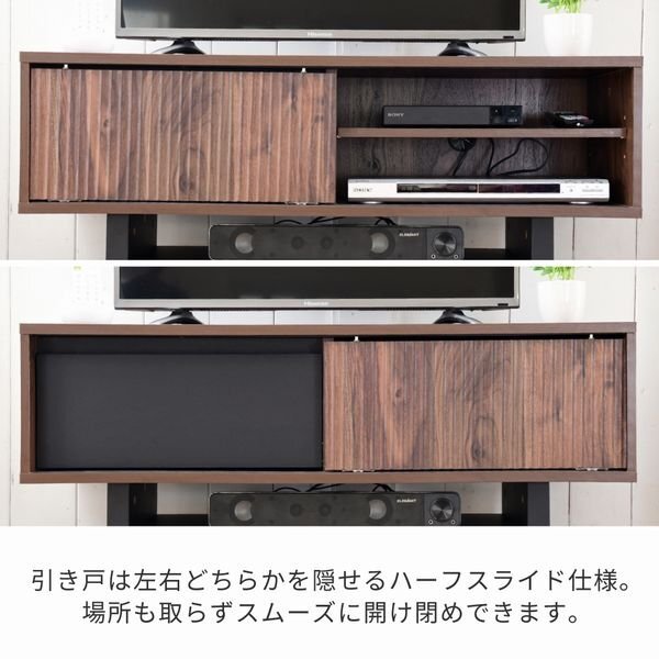 引き戸の波型が印象的な、落ち着きのある和とモダンなテイストを組み合わせた和モダンシリーズ"Aalto"。 テレビ台は少し高めの48cmで、引き出しや可動棚収納、オープンラックが付いた収納力抜群の設計です。 |