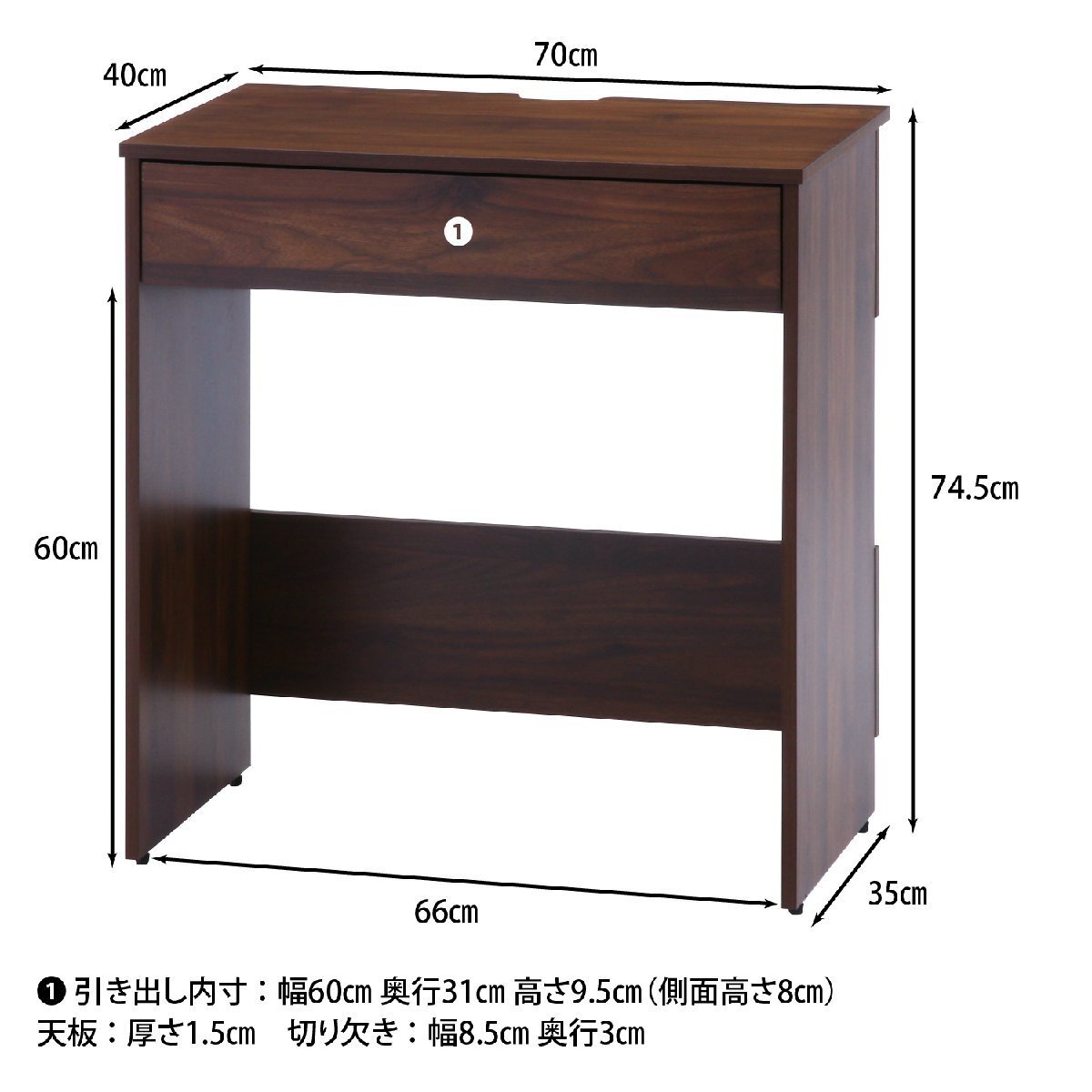 | サイズ | 全体:幅700 × 奥行400 × 高さ745mm 耐荷重(天板):20kg 耐荷重(引出):5kg 天板厚み:15mm 引出内寸:600x310x80(110)mm |