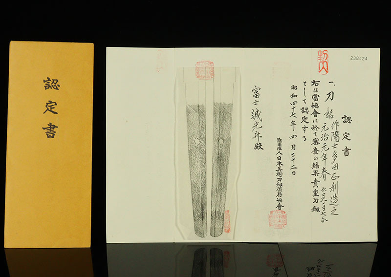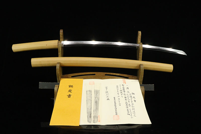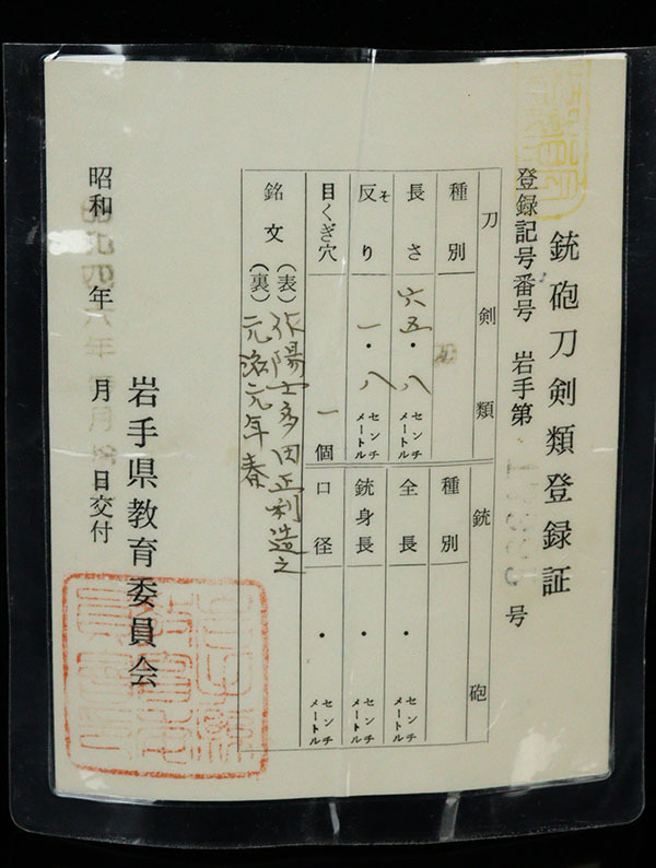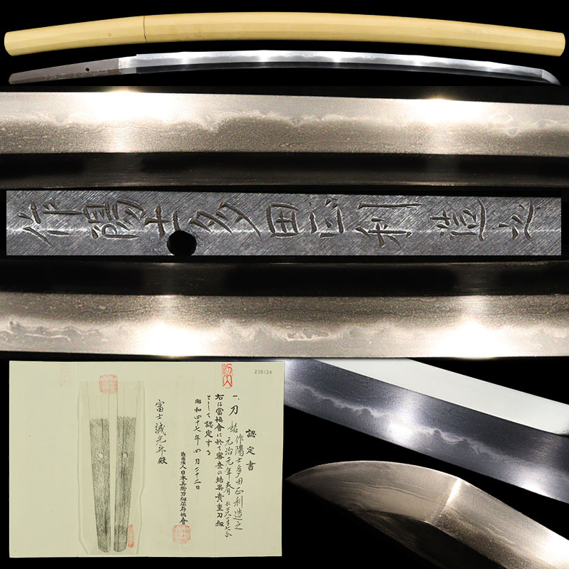 | ■刀剣のサイズ表示について 元幅・・・焼出し付近を測定しております 先幅・・・横手筋付近を測定しております 元重ね・・・焼出し付近の厚みを測定しております 先重ね・・・横手付近の厚みを測定しております (多少の誤差はご容赦ねがいます) ■銃砲類のサイズ表示について 全長・・・銃身先から台木尻までを測定しております 銃身・・・台木を除いて金属部分を測定しております (多少の誤差はご容赦ねがいます) 当社が出品する刀剣類は、入手した時の状態のまま出品しております。 ハバキ、小道具等も当社で調整したり付け替えたりはしておりませんので、合わせではないかというクレームは一切受け付けません。 刀身の疵も隠すことなく載せておりますので写真をよくご覧になってご入札ください。 疵に関して、説明がない等のクレームは一切受け付けません。 写真ではわかりにくい部分は質問欄やお電話でお問い合わせください。 但し、説明欄に表記のない刃切れに関してのみ返品やご相談に応じます。 ※ご落札しご購入されお手元に届いてから20日以内に 登録証に記載されている各都道府県の教育委員会にご連絡し 登録証の所有者変更を必ず行ってください | |||