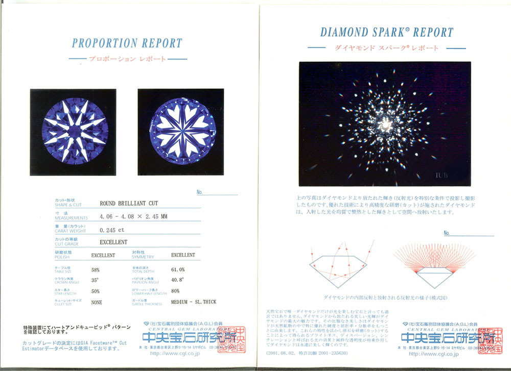 | カット:トリプルエクセレント(3EX) ハートアンドキューピット(H&C)中央宝石研究所 鑑定書付 |