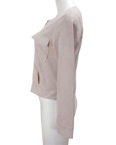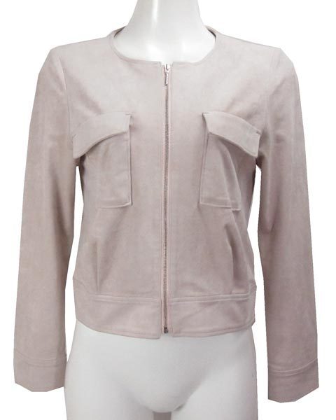 | 薄いグレー味の入ったような淡い可愛いピンクのジャケット。肌触りの良いスウェード調で柔らかめの生地なので着心地が良い。ショート丈で、脚長効果のあるデザイン。お袖のやや大きめのロゴ入りボタンも可愛い。 |