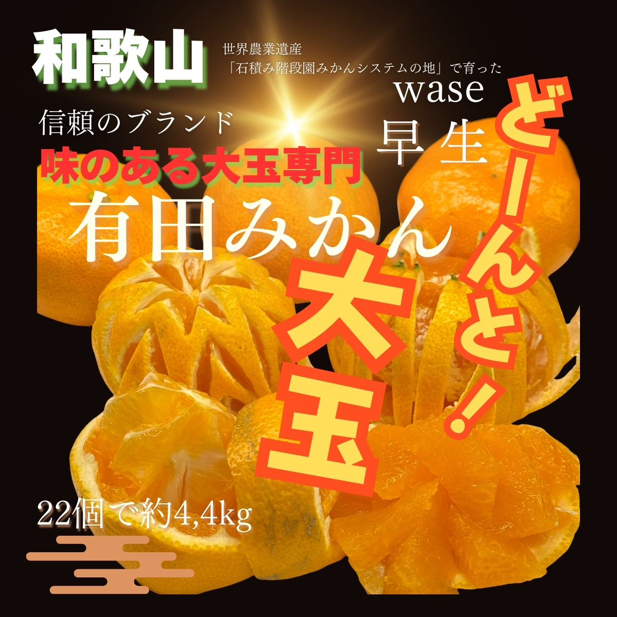 甘くてジューシーな大玉有田みかんを、たっぷり4.4kg(22個)お届けします。
