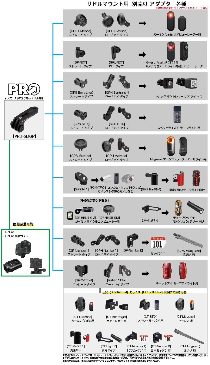 【特徴】GoPro HEROシリーズのカメラ または ゴープロインターフェイスのある互換性があるカメラや、GPの型番で始まるセーフティライトアダプター・テール系アダプター(泥除け/ゼッケンなど)・カメラアダプター・ライトアダプター・サイクルコンピューターアダプターなどが取付可能